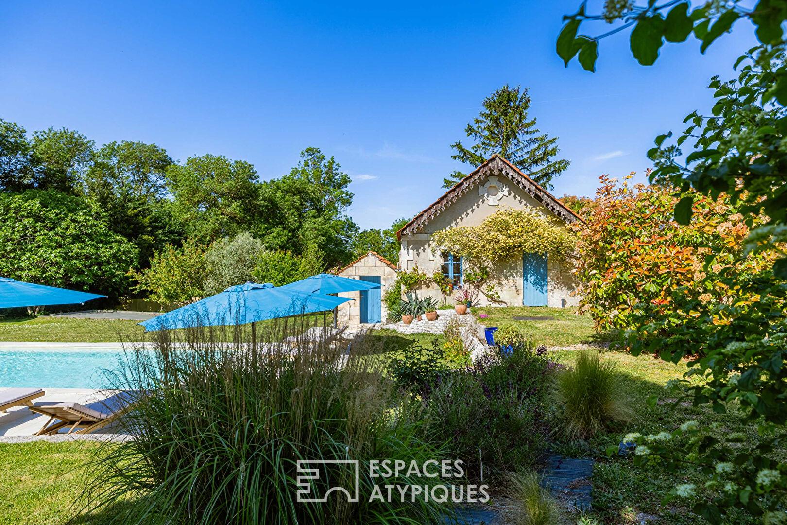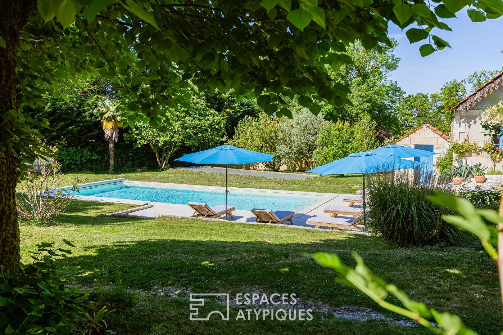À l’extérieur, le domaine s’inscrit sur une parcelle de plus de 2 500 m2, offrant un cadre de vie paisible, rythmé par les saisons. Le jardin, aux accents naturels et légèrement vallonné, accueille une piscine élégamment intégrée, véritable invitation à la détente. Terrasses, espaces ombragés et coins de convivialité composent un environnement idéal pour une activité touristique ou une résidence secondaire de caractère.