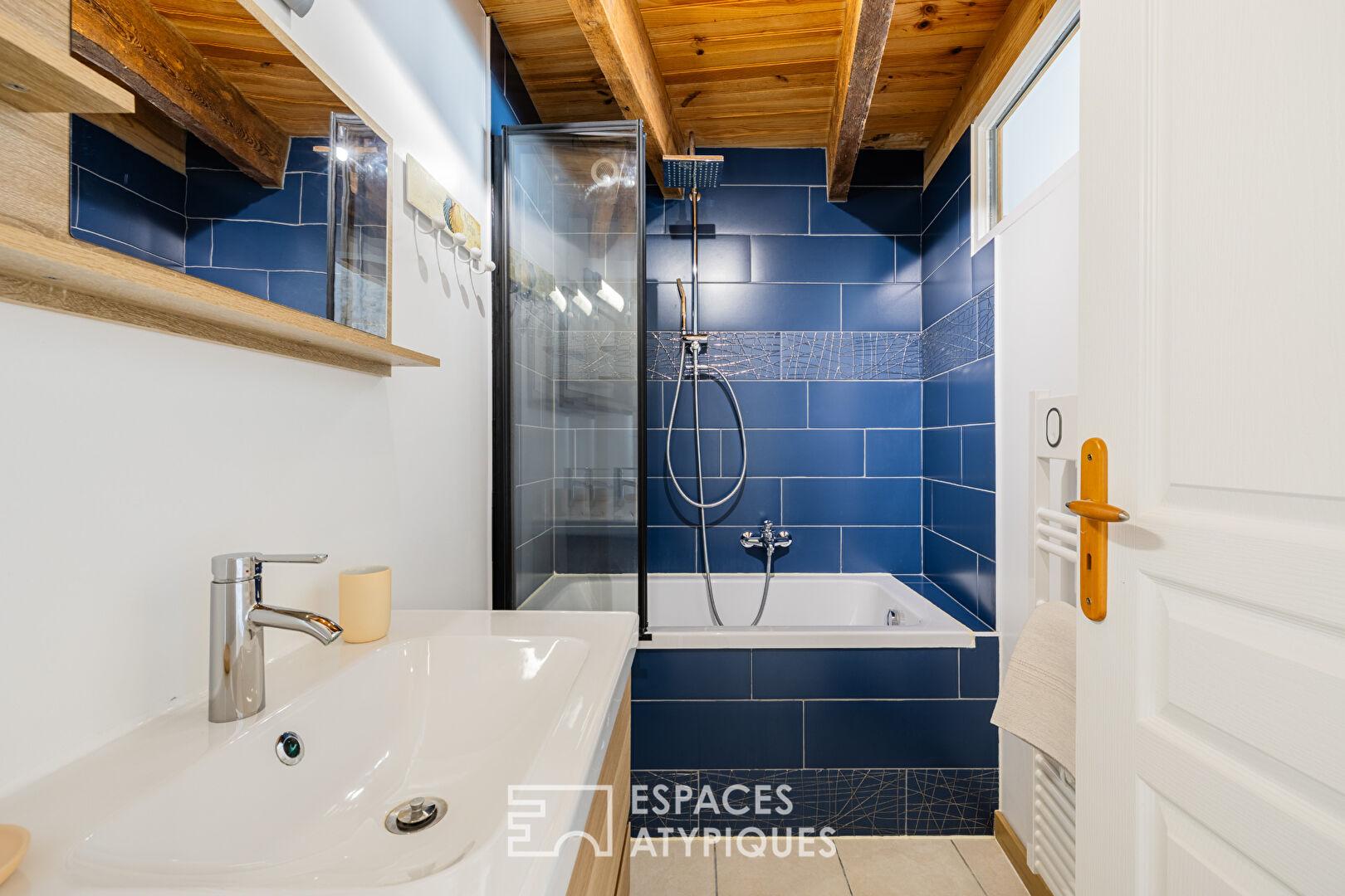 Derrière sa façade aux volets bleus, signature des maisons de caractère de la région, la propriété développe environ 355 m2 habitables, subtilement répartis entre une habitation principale indépendante et un espace dédié à l’activité de gîtes.
