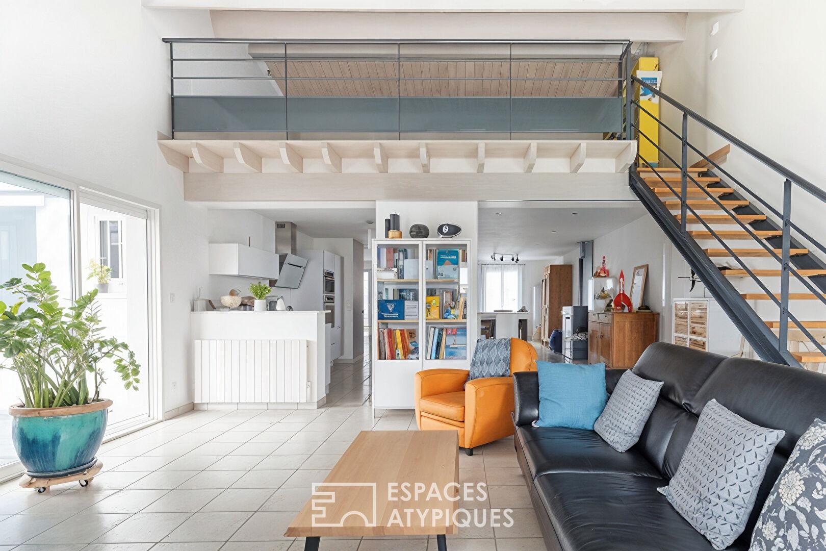Baigné de clarté grâce à ses larges baies vitrées, le salon s’ouvre généreusement sur le jardin. Ses volumes aériens sont magnifiés par une mezzanine élégante, offrant un espace polyvalent idéal pour un bureau inspirant ou une salle de jeux.
