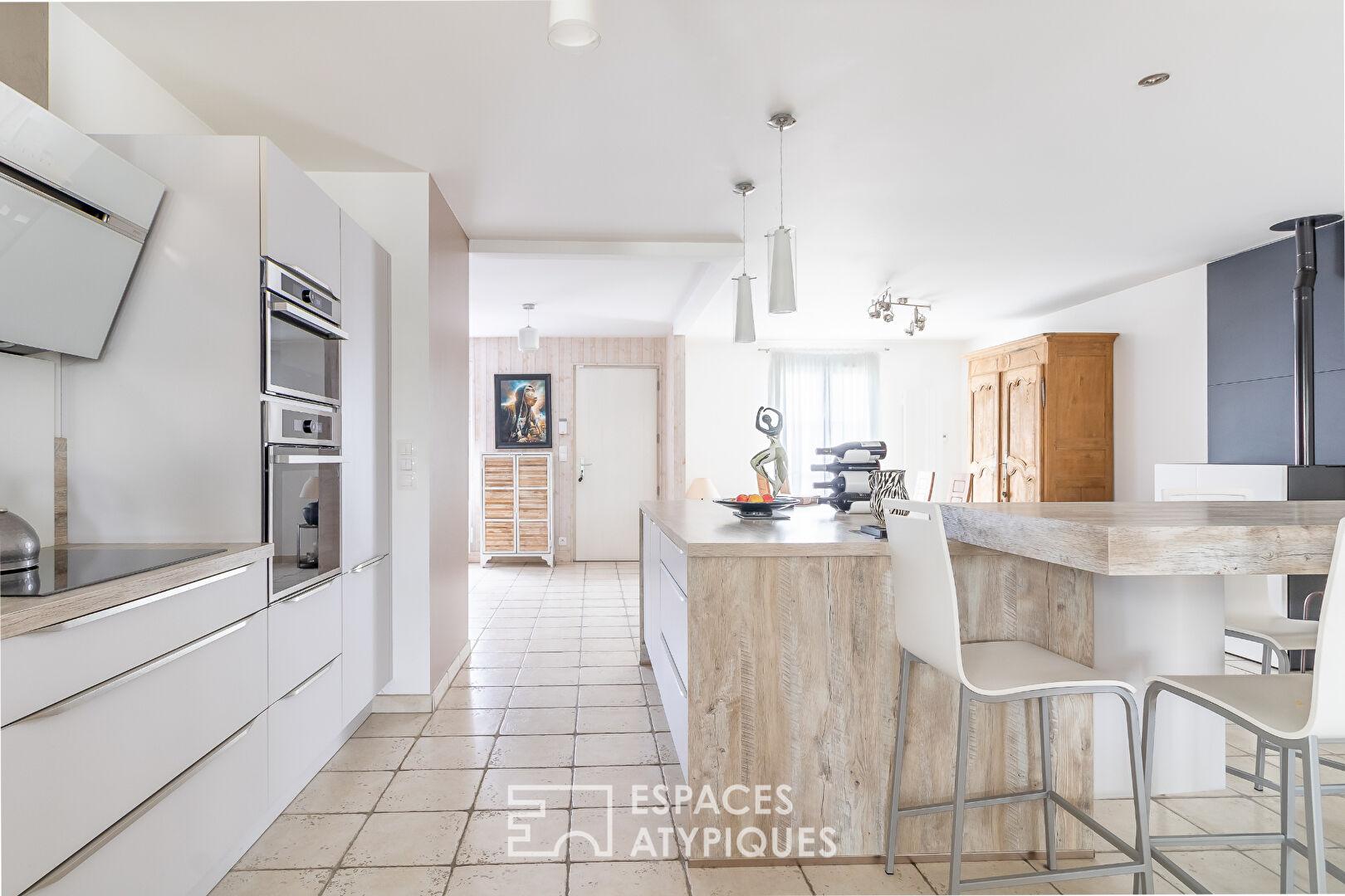 L’entrée de la maison s’ouvre sur un vaste séjour ouvert traversant Est-Ouest, organisé autour de plusieurs espaces de vie. La salle à manger, réchauffée par un poêle à granulés, dialogue avec une cuisine ouverte équipée d’un îlot central, offrant de nombreux rangements et de larges plans de travail.