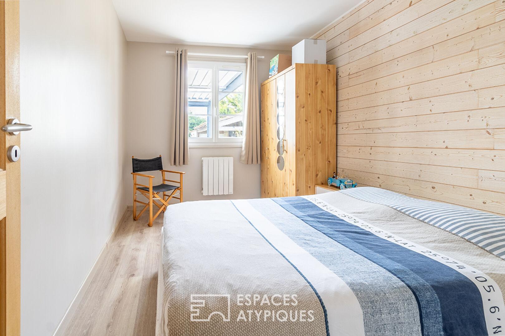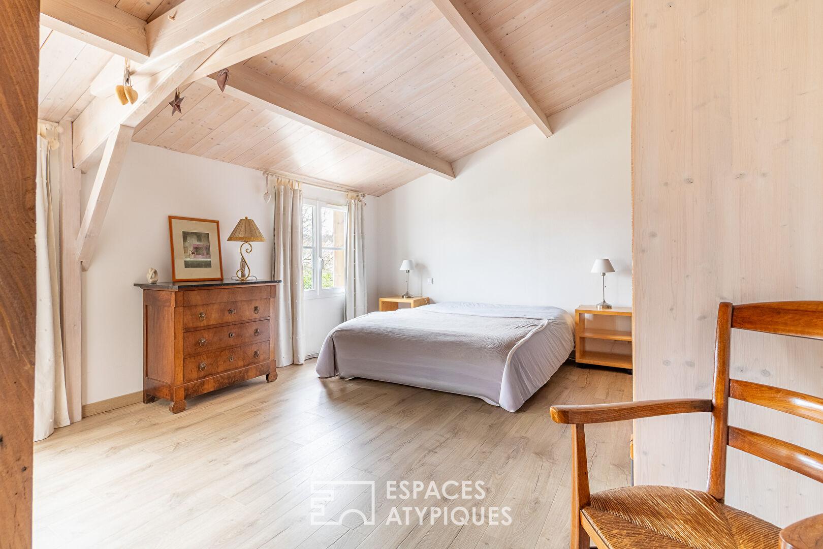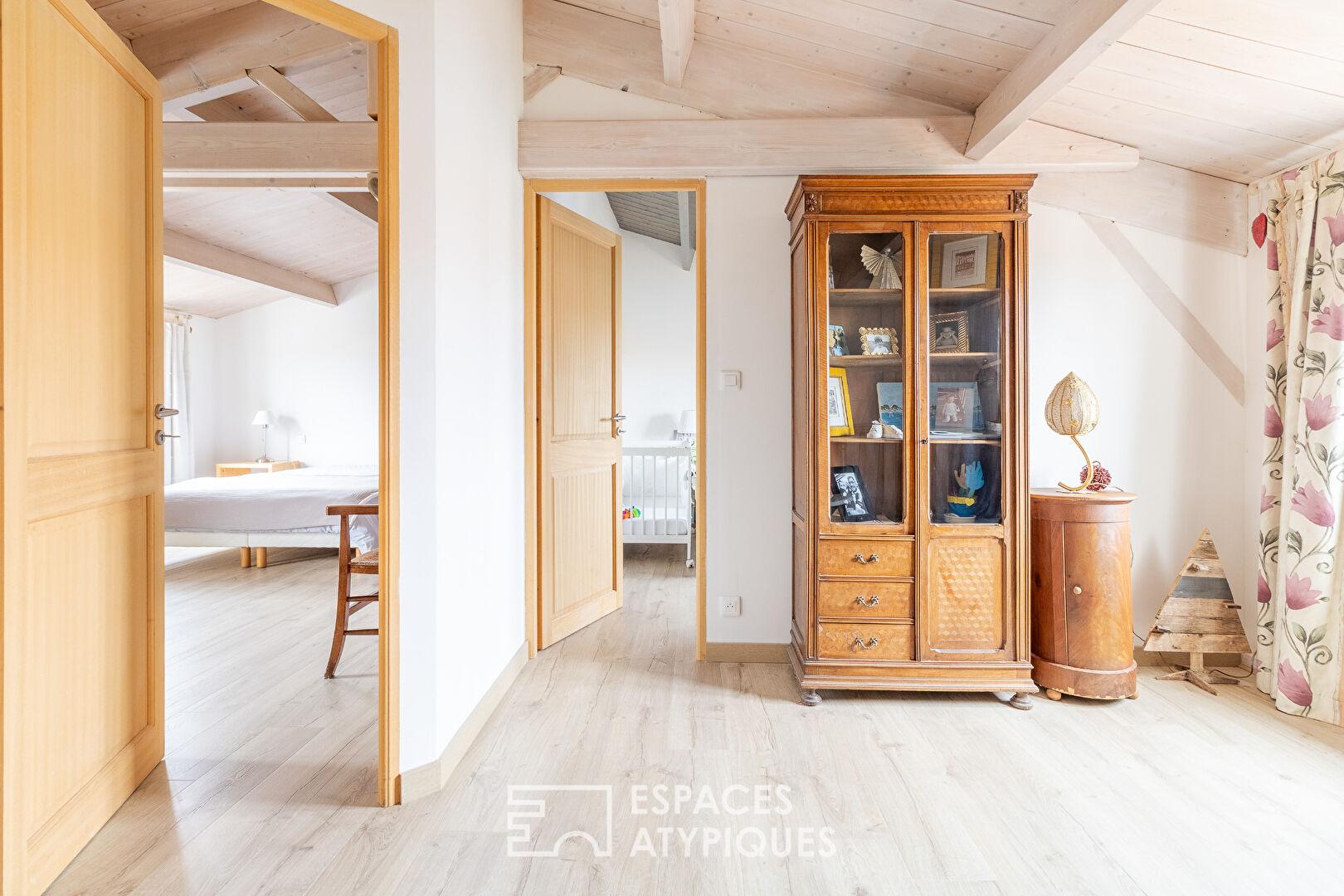 Le rez-de-chaussée accueille également un premier espace nuit composé de deux chambres et d’une salle d’eau. À l’étage, un palier chaleureux dessert deux chambres supplémentaires avec charpente apparente, partageant une seconde salle d’eau.