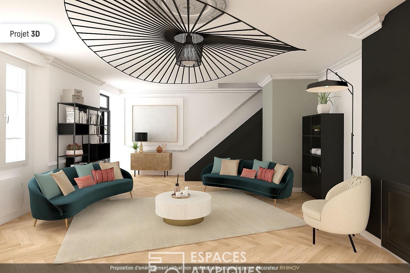 La cheminée et l’escalier noirs modernisent l’ensemble et permettent de projeter une décoration tout aussi classique que très actuelle.