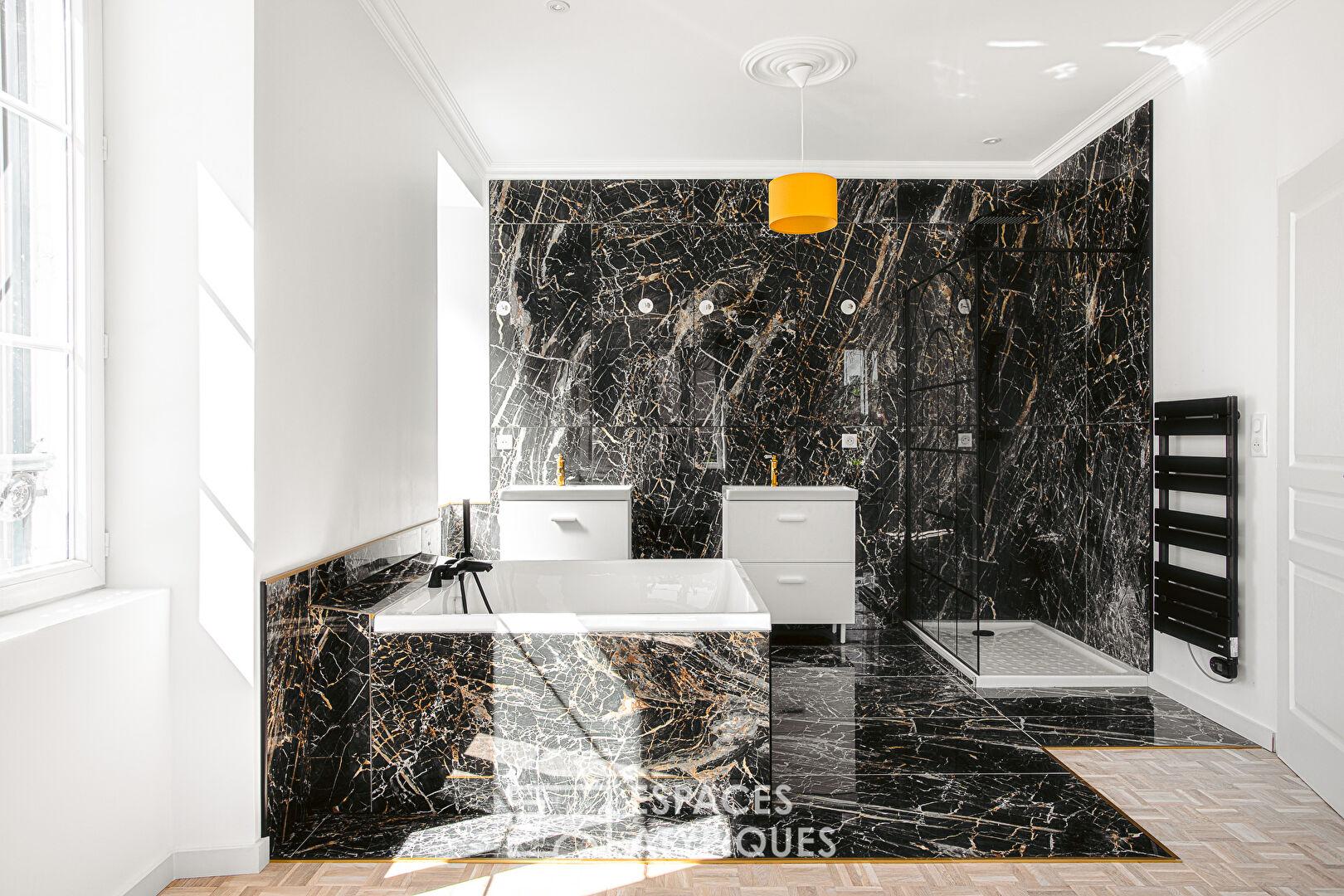 Véritable signature des appartements haussmanniens, la hauteur sous plafond, la cheminée, les moulures, les boiseries murales et les parquets nobles côtoient les pièces de marbre, les couleurs contemporaines et des choix décoratifs signés.