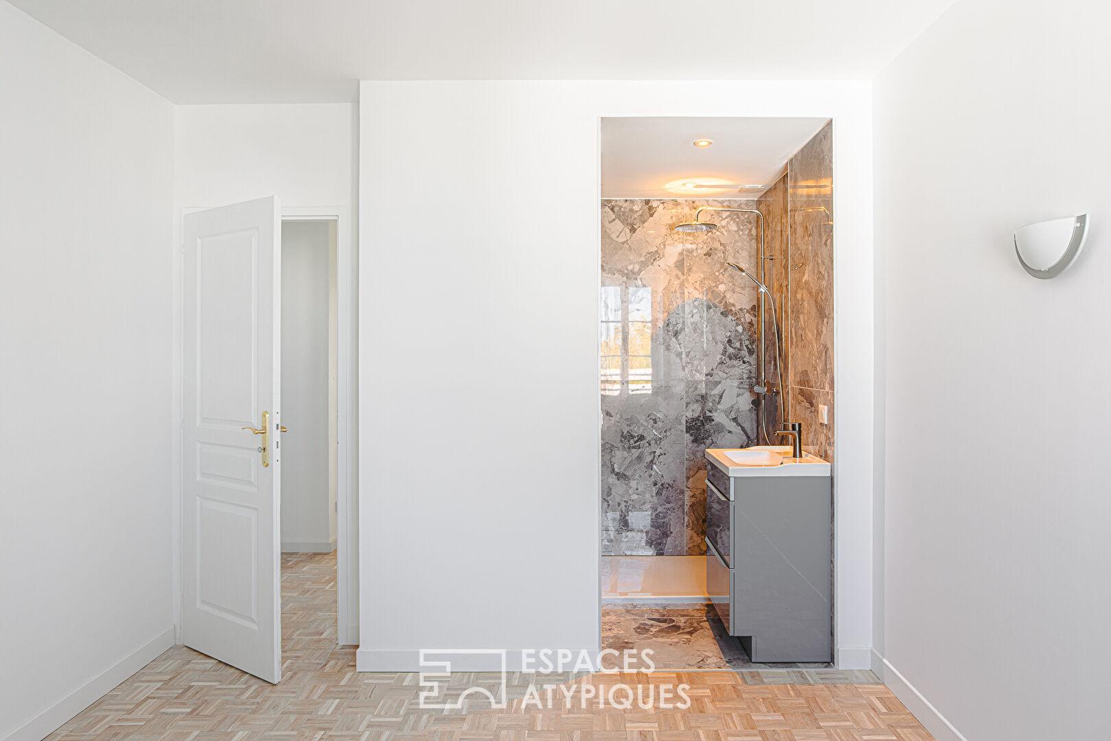 A l’étage, le palier dessert côté jardin, deux suites avec espace nuit, placard et salle de bain ou salle d’eau. Baignée d’une clarté identique à celle du séjour grâce à ses larges ouvertures, la suite parentale dévoile, par-delà d’élégantes voûtes, un dressing sur mesure. L’espace nuit se prolonge majestueusement vers une salle de bain ouverte, où le marbre noir souligne une esthétique résolument luxueuse.