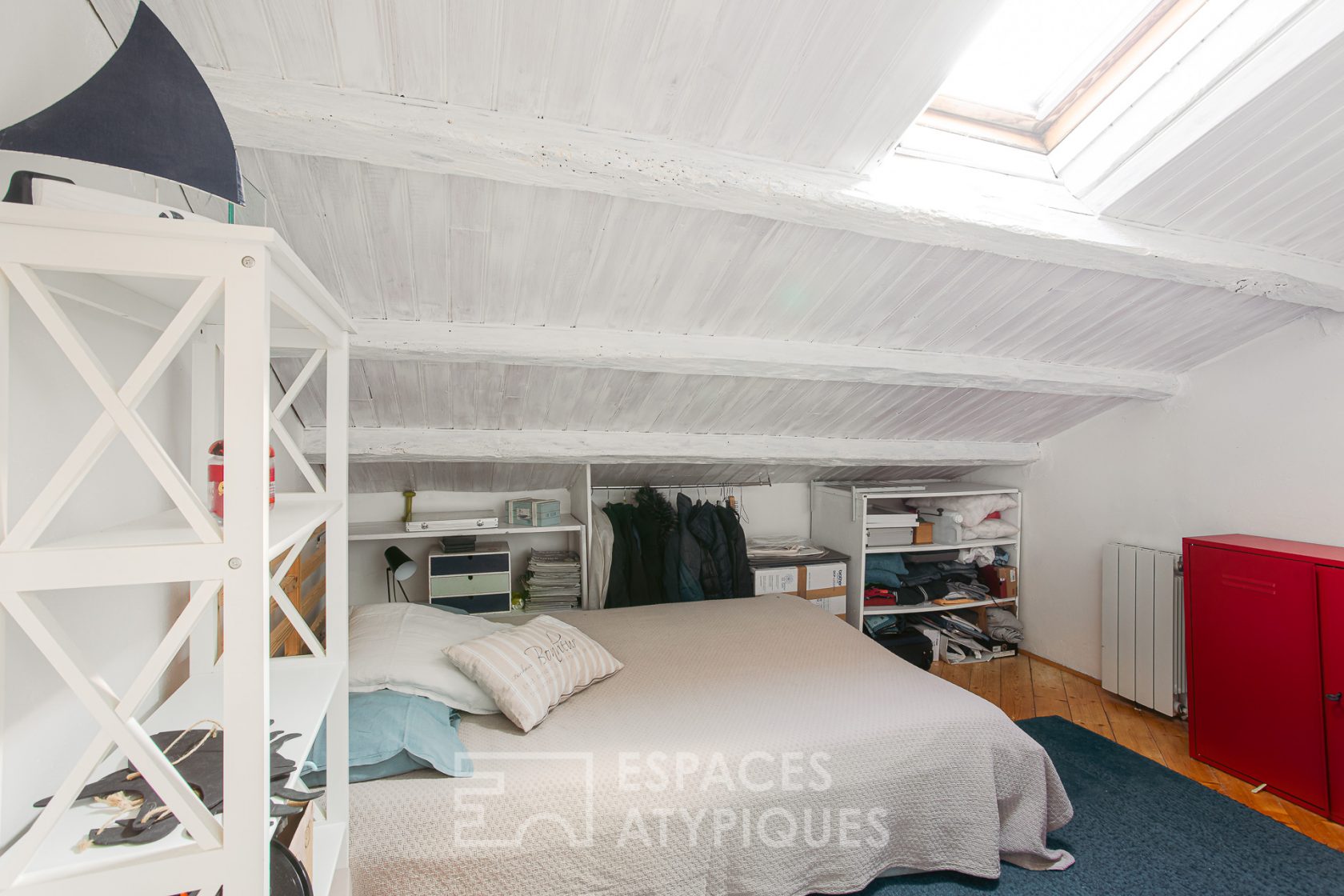 Ses fenêtres et volets bleus ressortent sur sa façade en pierres calcaires apparentes. Quand à l’intérieur le code couleur est le blanc, saupoudré de subtiles nuances de gris et de bois clair.