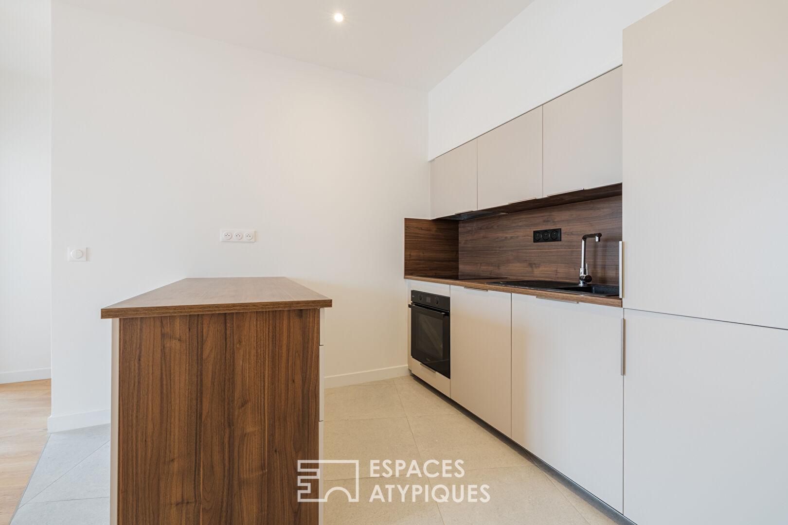 Situé au premier et dernier étage d’une petite résidence à l’architecture inspirée des années 50, cet appartement profite d’une rénovation contemporaine et de qualité.