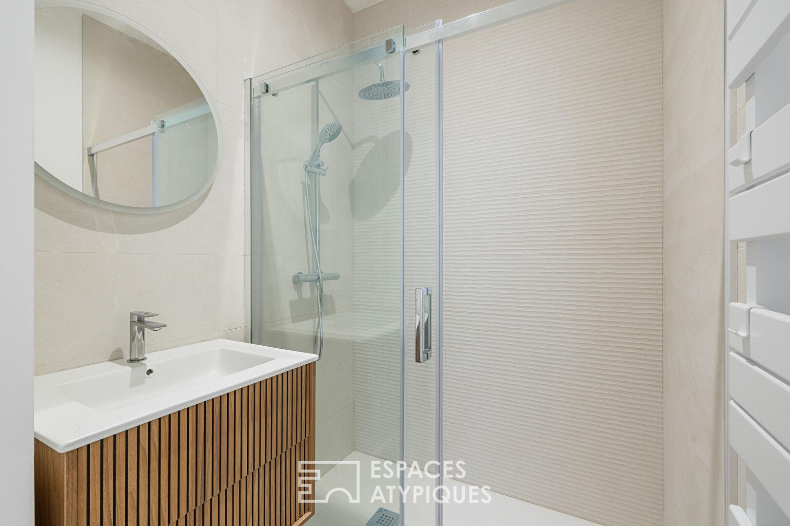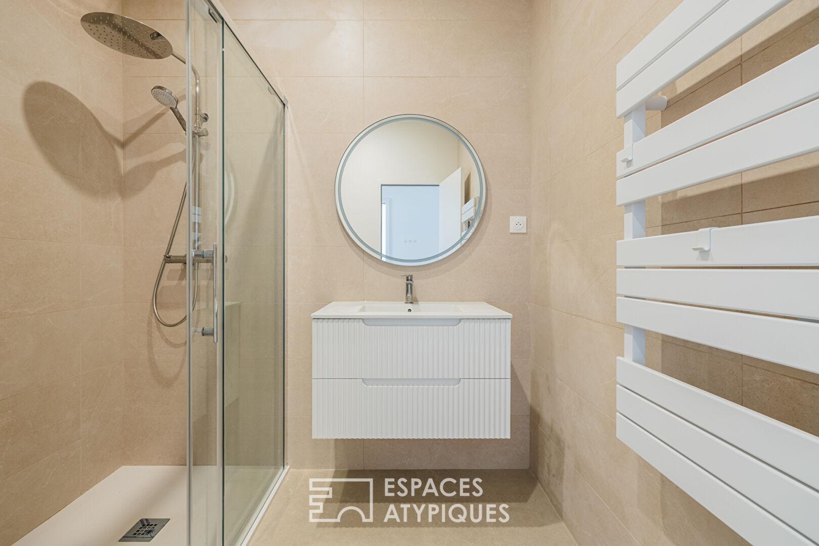 La distribution des espaces nuit est tout aussi soignée : une première chambre dispose d’un dressing baigné de lumière sous verrière ainsi que d’une salle d’eau attenante.