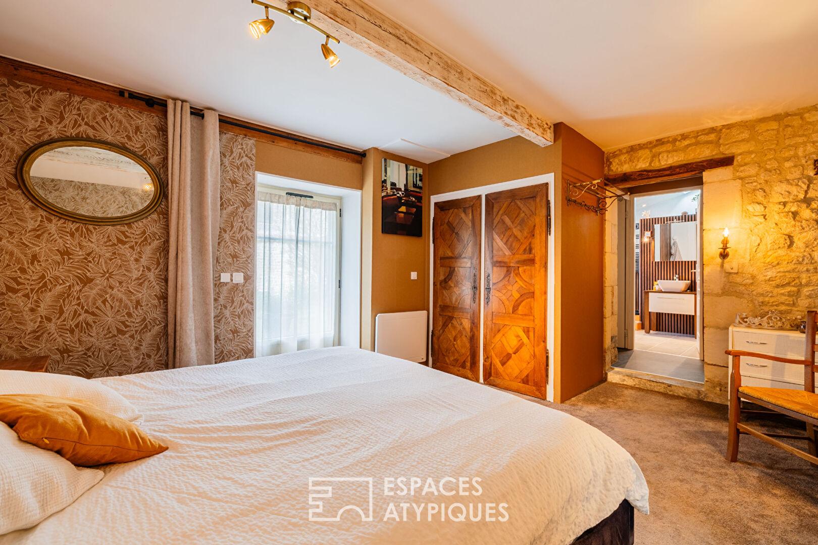 L’entrée dévoile un volume magistral aménagé dans un ancien chai. Le vaste séjour, sublimé par des pierres apparentes, s’ouvre généreusement sur le jardin et se prolonge par une terrasse couverte. Le salon profite de la vue sur le jardin. L’espace dînatoire est réchauffé par un poêle à bois double face, tandis que la cuisine conviviale dispose d’un îlot central avec plans de travail en granit et d’un cellier. Le chai communiquant avec l’ancienne habitation de la ferme, cette partie abrite une seconde pièce de vie, idéale comme salon de lecture ou bureau. Ce niveau de plain-pied comprend également deux chambres, dont une suite parentale à l’atmosphère feutrée dotée de sa salle d’eau privative. Une salle d’eau supplémentaire complète le rez-de-chaussée.