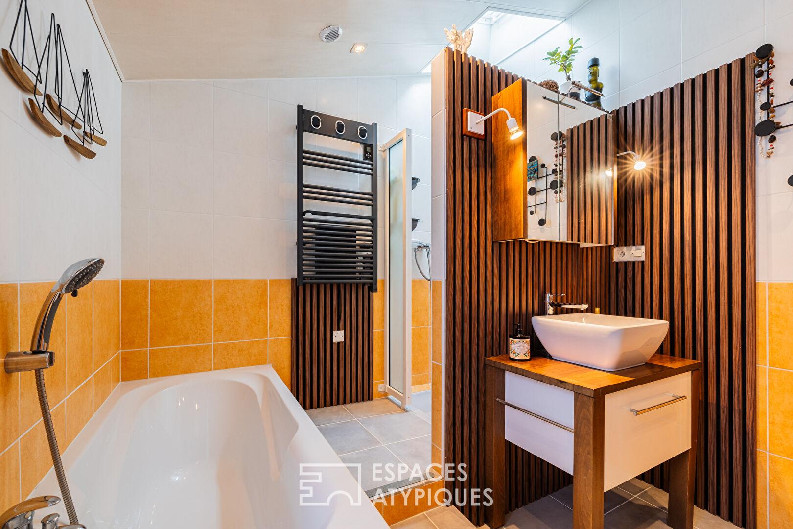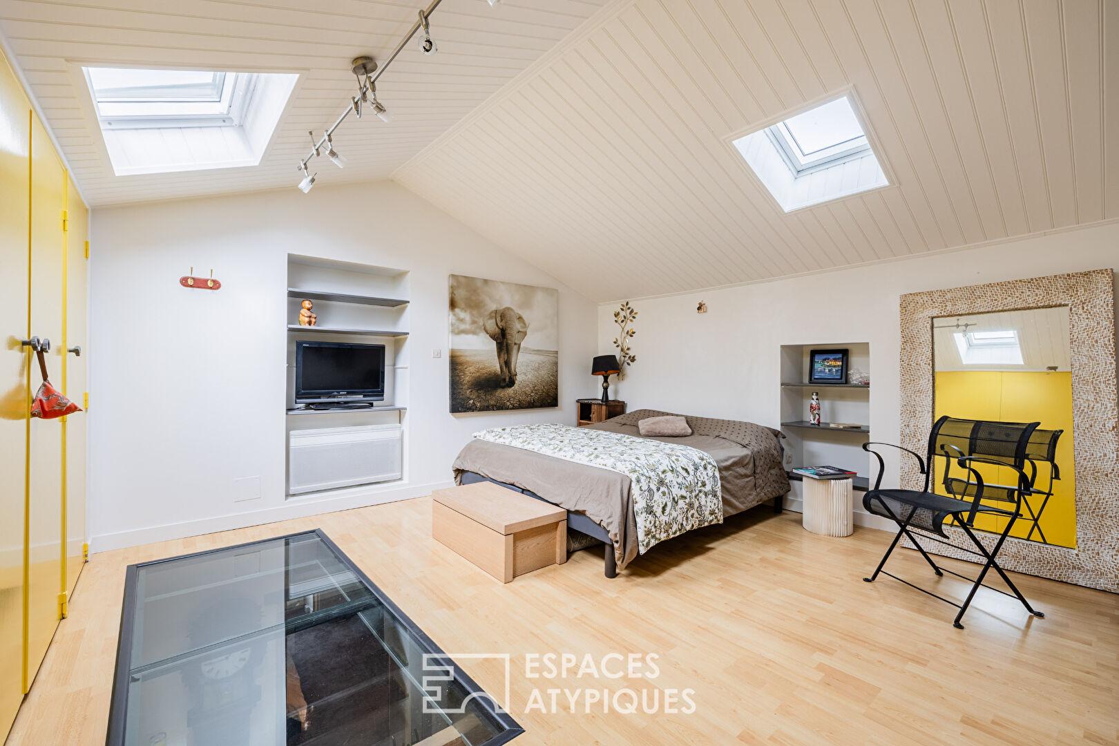 À l’étage, l’espace nuit se poursuit avec trois belles chambres spacieuses. Elles se partagent un bureau ouvert qui distribue une salle d’eau.
