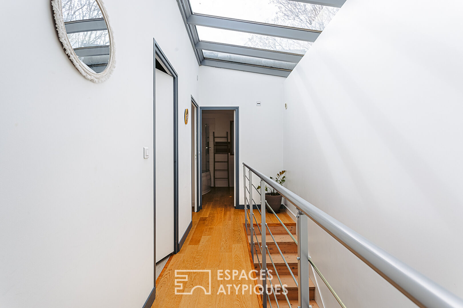 L’étage qui profite d’un ensoleillement optimal grâce à la verrière, dispose de trois chambres avec placards qui se partagent une salle de bains avec wc, une distribution idéale pour une famille.