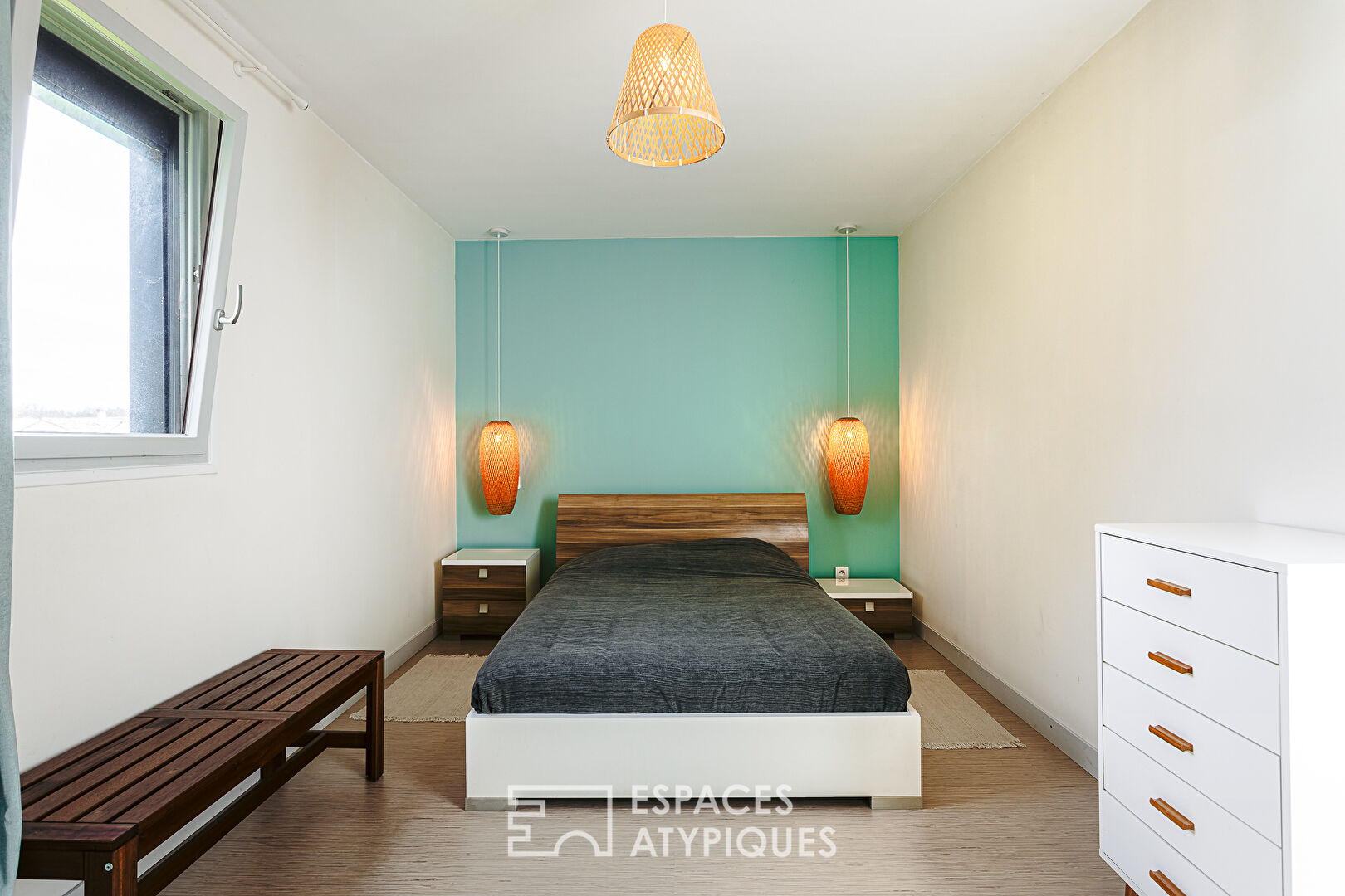 Les deux baies vitrées ouvertes sur la terrasse offrent un prolongement de la pièce à vivre vers l’extérieur, une invitation aux déjeuners en famille ou entre amis.