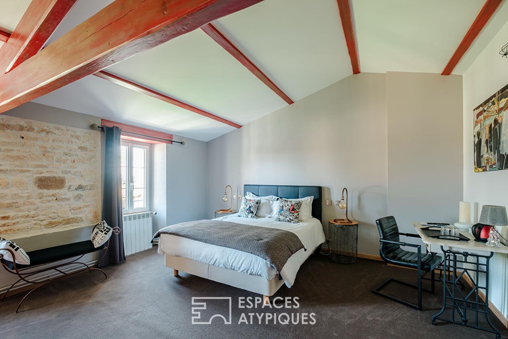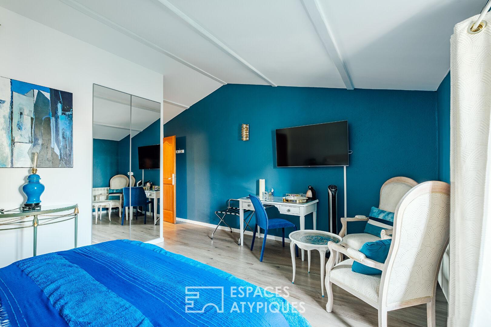 À l’étage, l’espace se déploie sous de généreux volumes rampants abritant quatre autres suites. Chaque chambre, traitée comme un univers à part entière à la décoration soignée, bénéficie de sa propre salle d’eau privative. Ces pièces d’eau sont de véritables atouts de charme : tantôt vibrantes par des jeux de faïences colorées, tantôt apaisantes par l’usage du bois et de tons naturels, elles ajoutent toutes des prestations de qualité.