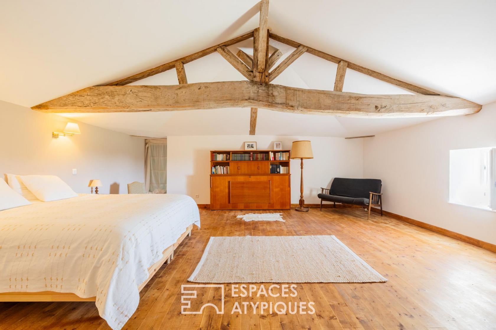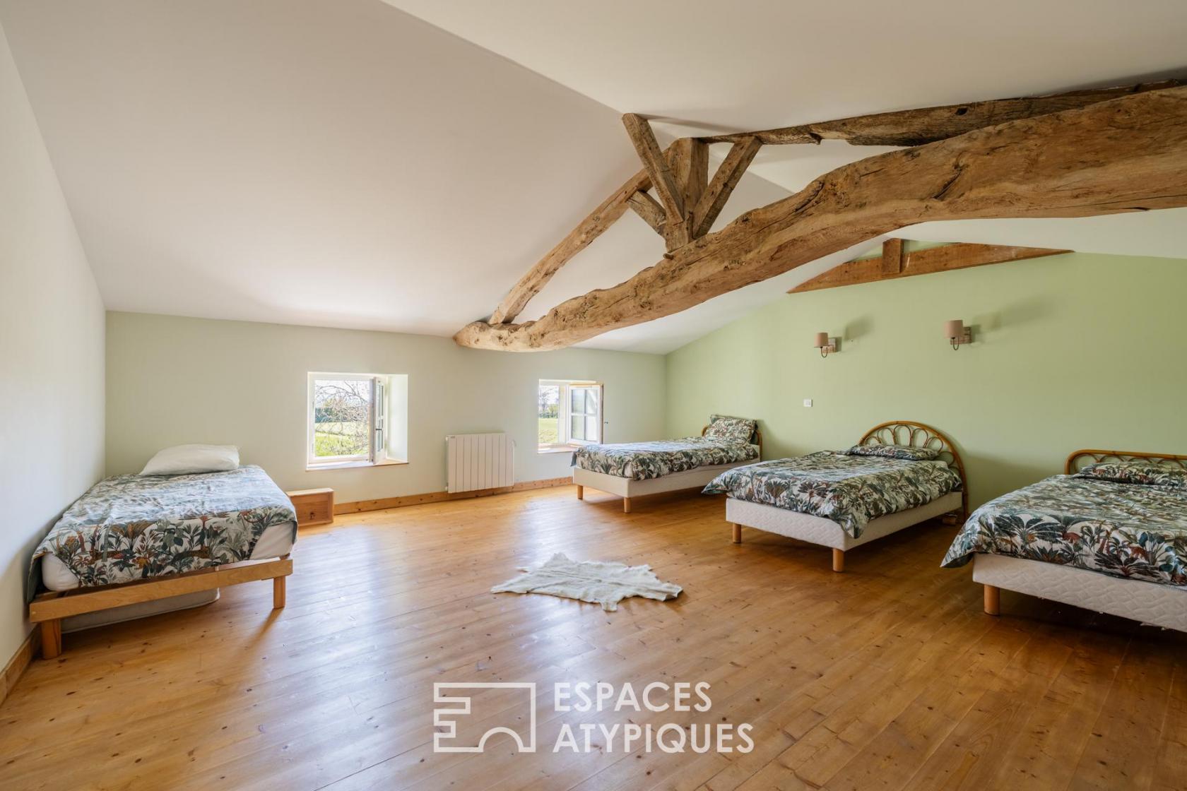 L’espace nuit de plain-pied comprend deux chambres avec salles d’eau privatives. À l’étage, trois chambres généreuses et une salle de bain complètent la capacité d’accueil.