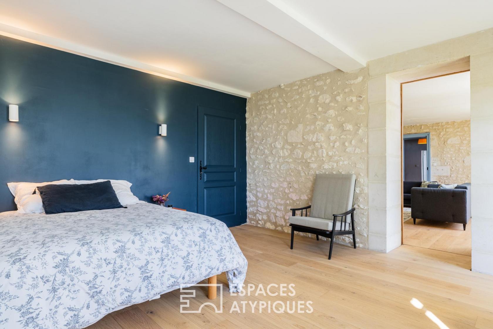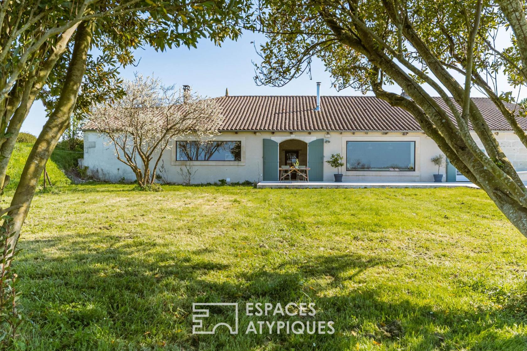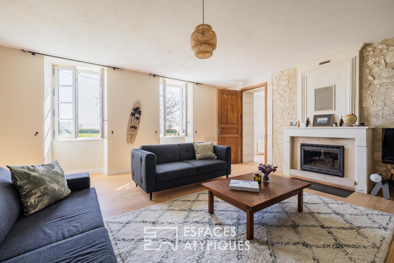 Située sur un vallon dominant l’estuaire de la Gironde, à Saint-Fort-sur-Gironde, cette longère charentaise en pierre de taille s’inscrit dans un environnement naturel emprunt de calme et de paysages dégagés.