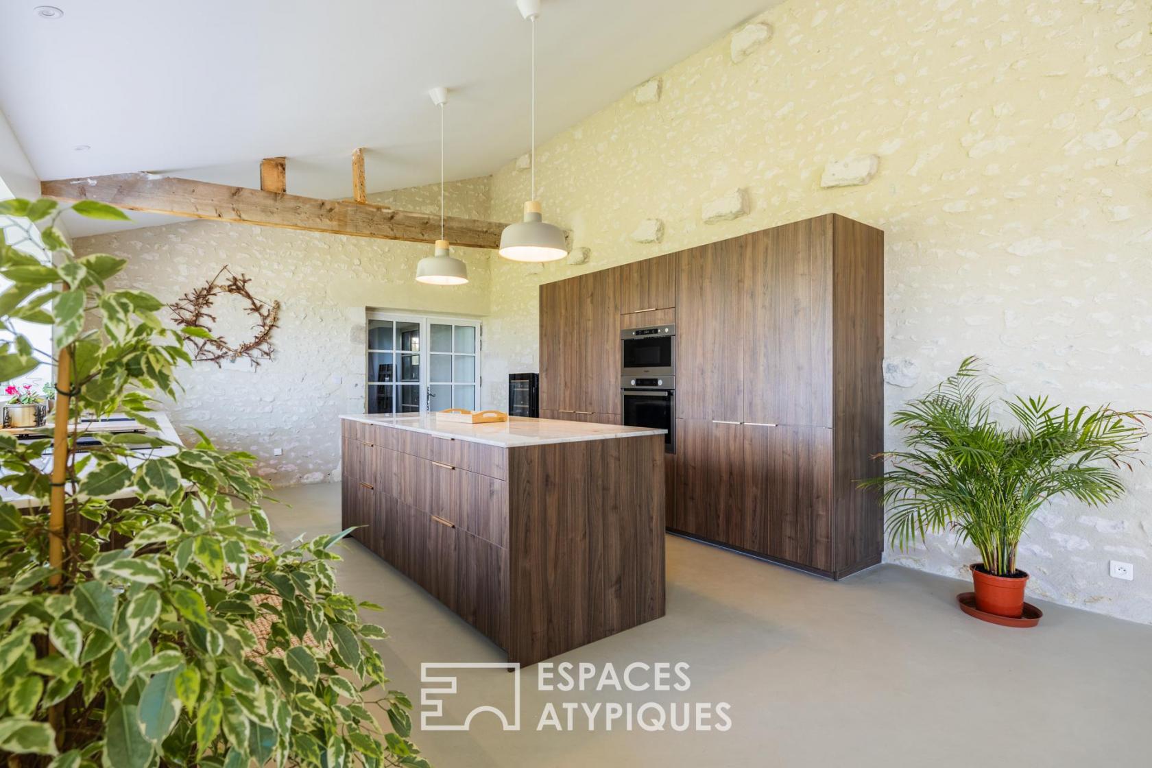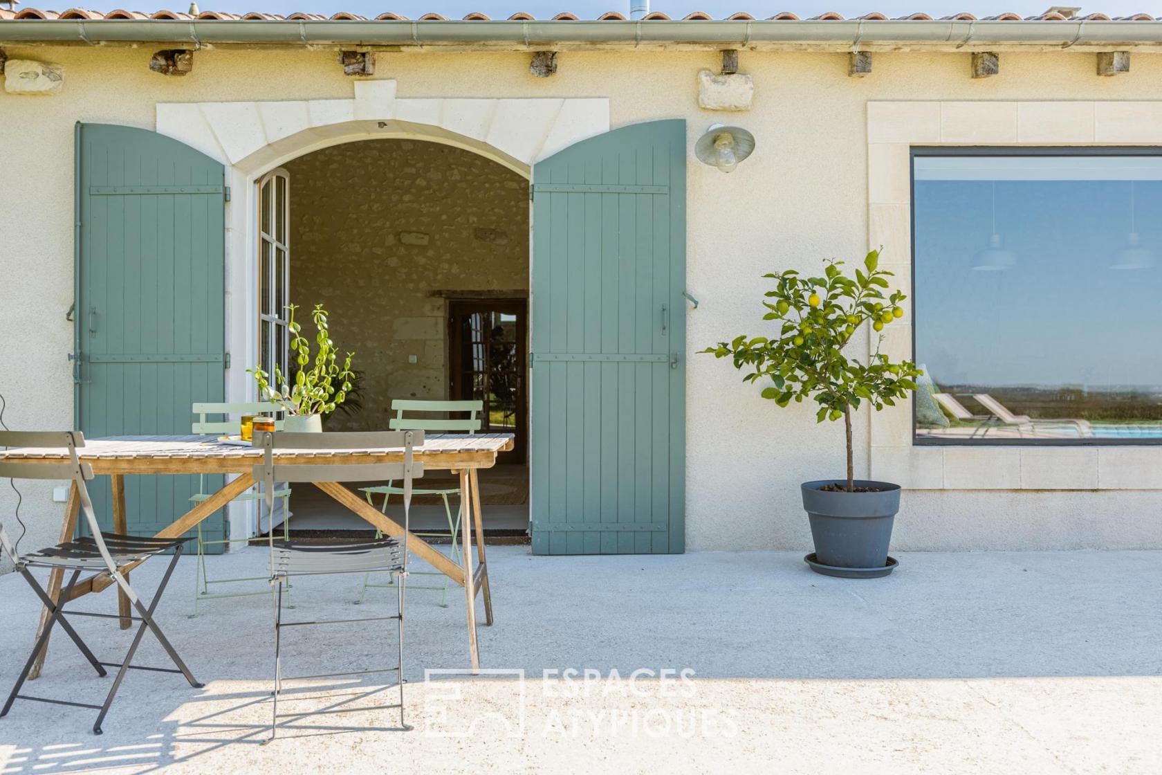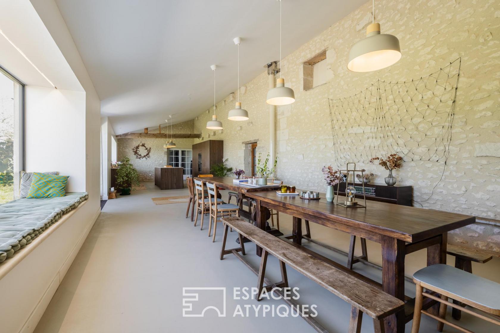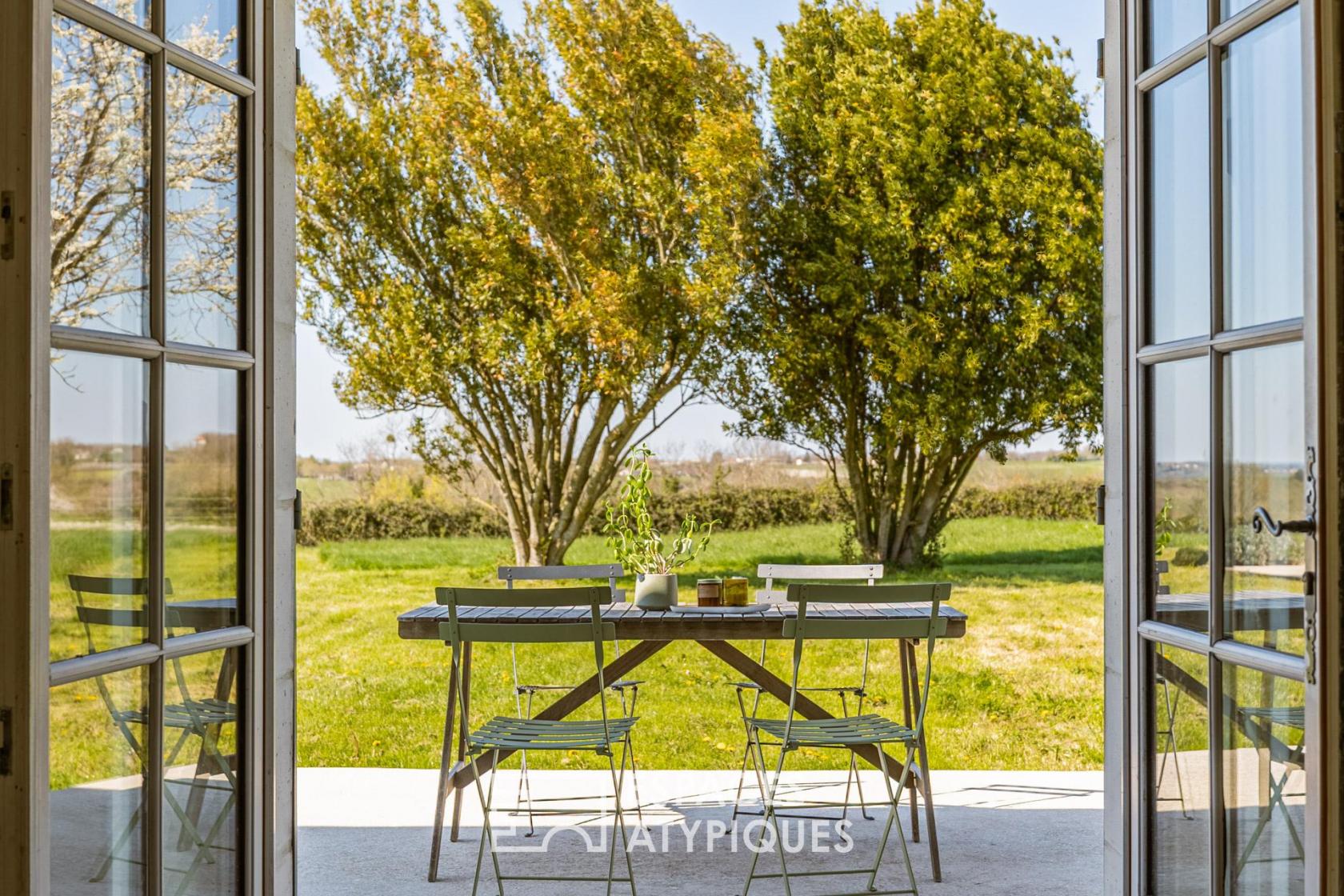 Située sur un vallon dominant l’estuaire de la Gironde, à Saint-Fort-sur-Gironde, cette longère charentaise en pierre de taille s’inscrit dans un environnement naturel emprunt de calme et de paysages dégagés.