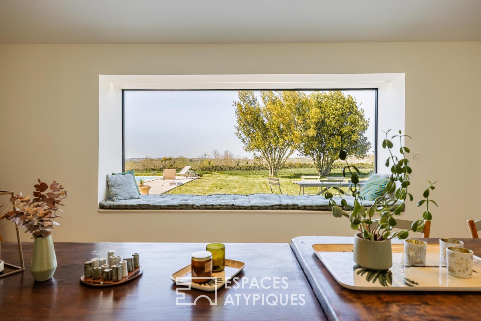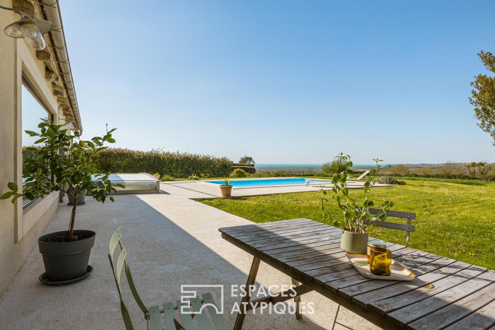 Le jardin, vaste étendue de calme et de verdure, permet de profiter pleinement de la sérénité du site. La terrasse borde la piscine, créant un espace de détente privilégié face aux reflets de l’eau et à l’abri de tout vis-à-vis.