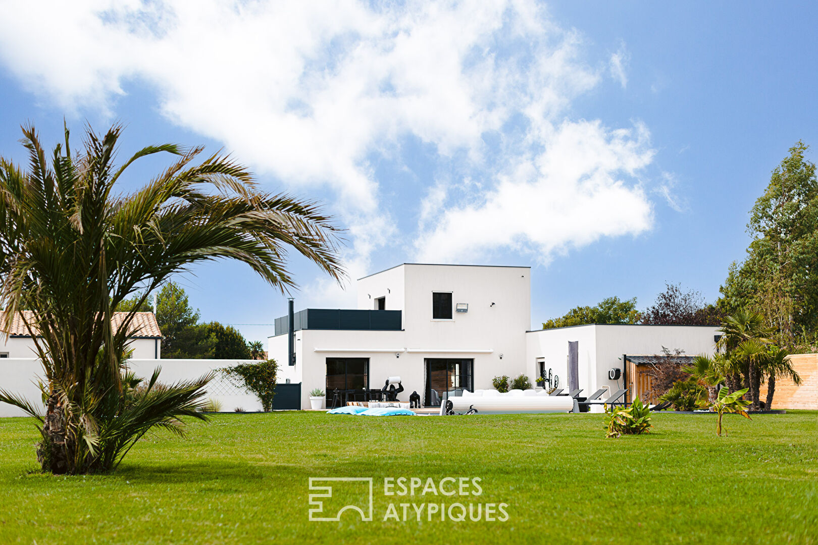 Nichée dans un environnement calme et apaisant, cette maison contemporaine construite en 2017 déploie ses 168 m2 habitables au coeur d’une généreuse parcelle de plus de 3 000 m2. Véritable trait d’union entre intérieur et extérieur, cette propriété lumineuse offre des prestations haut de gamme, incluant une piscine chauffée et un vaste parc paysagé, le tout à seulement 10 minutes de la gare TGV de Surgères et 25 minutes du bord de mer.