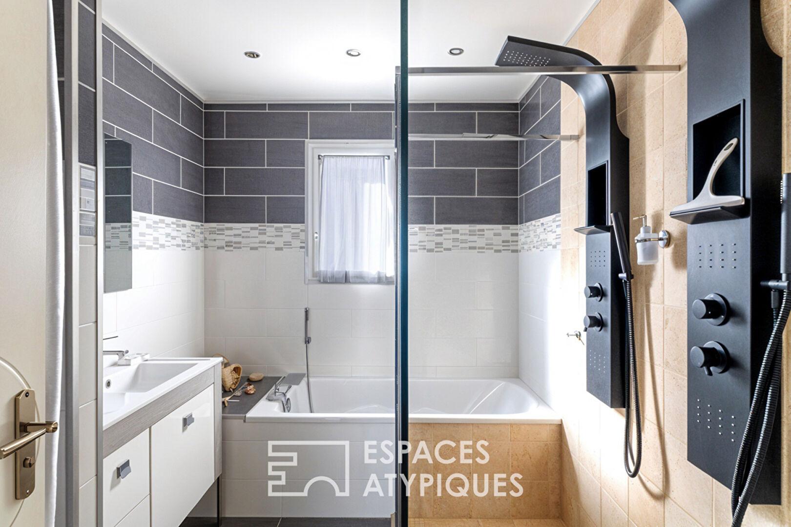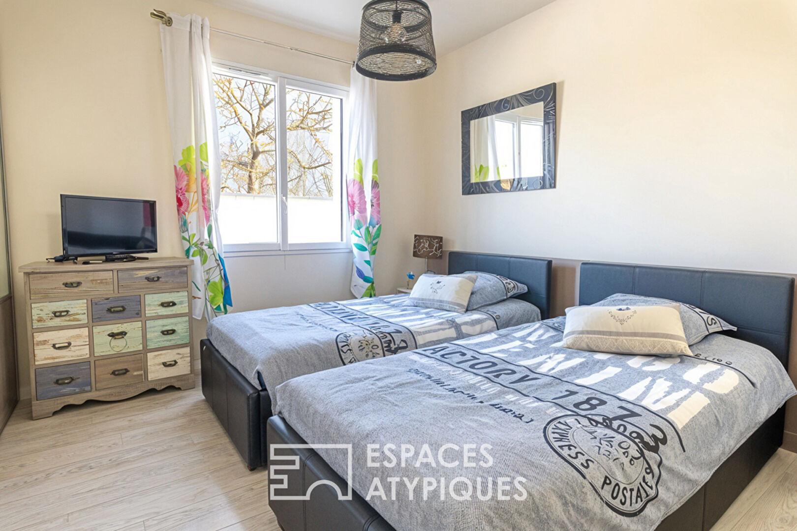 Côté nuit, l’organisation privilégie le confort avec deux chambres qui se partagent une salle de bains avec double douche et deux suites parentales complètes, une distribution qui permet à chacun d’avoir son intimité.