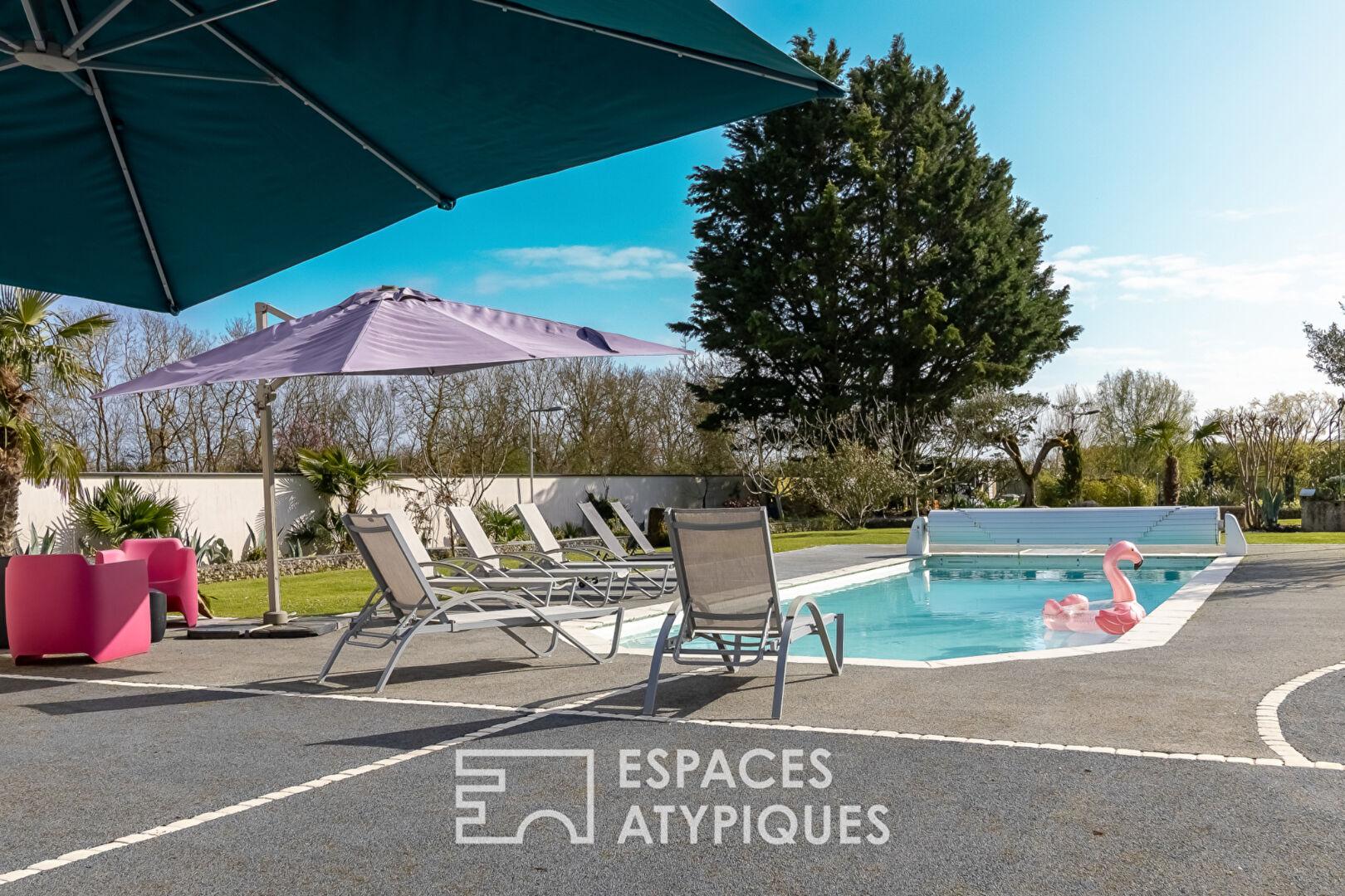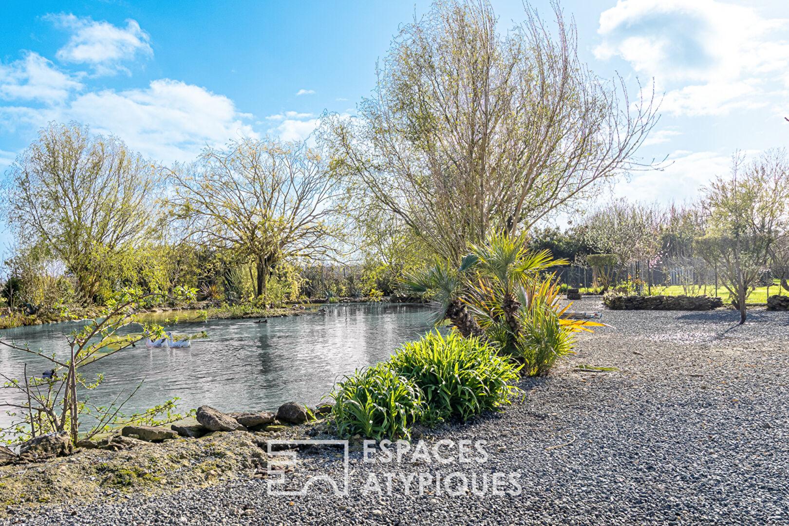 La piscine chauffée et sa cuisine d’été fond écho à un généreux terrain accueillant un étang, un verger, un potager et un boulodrome.