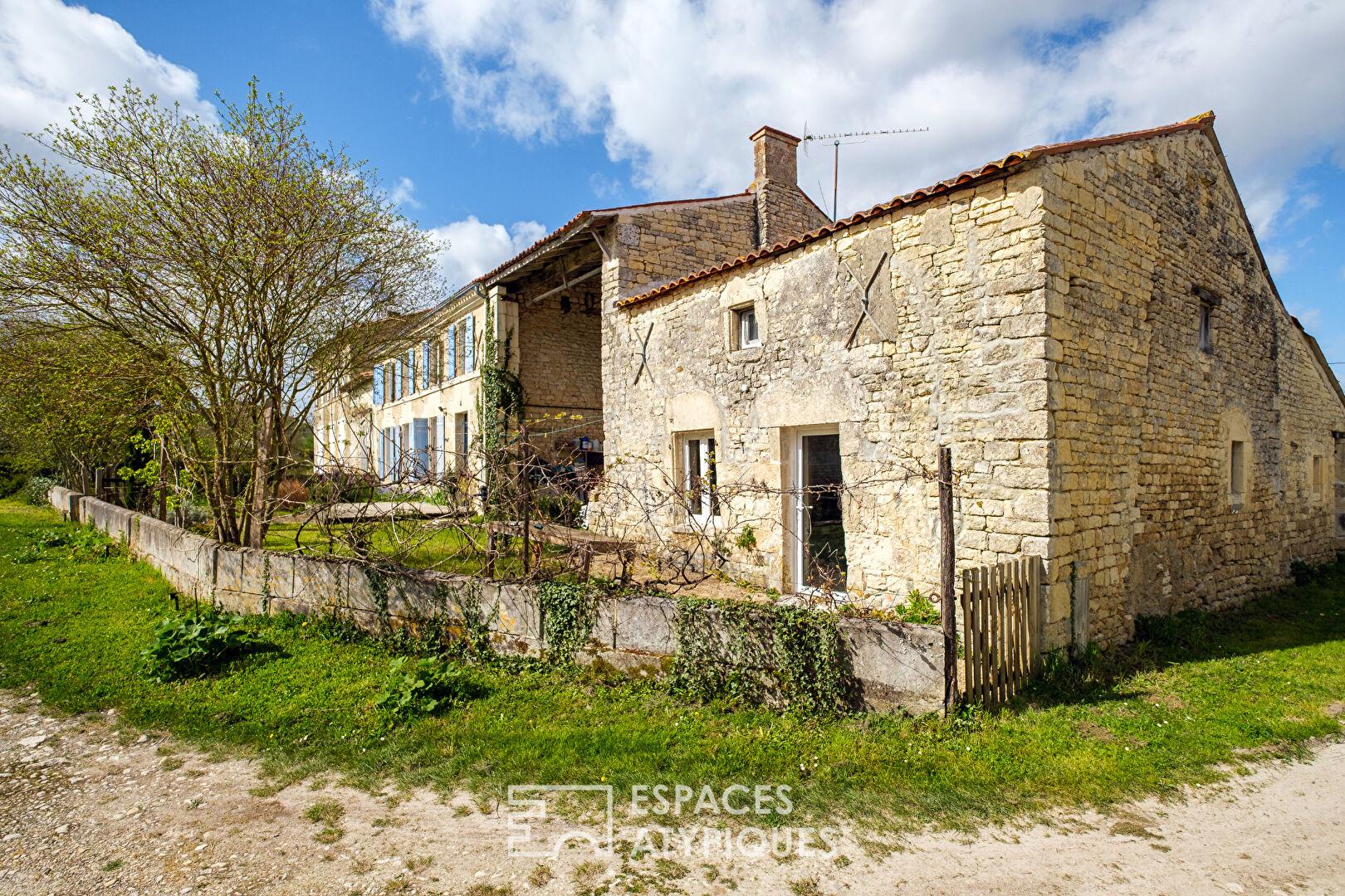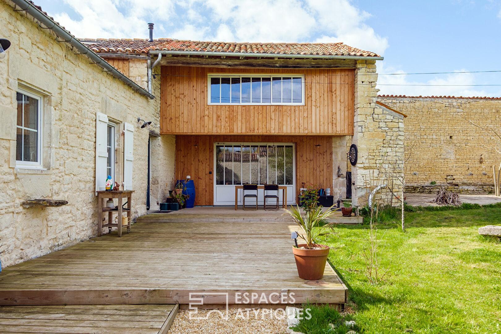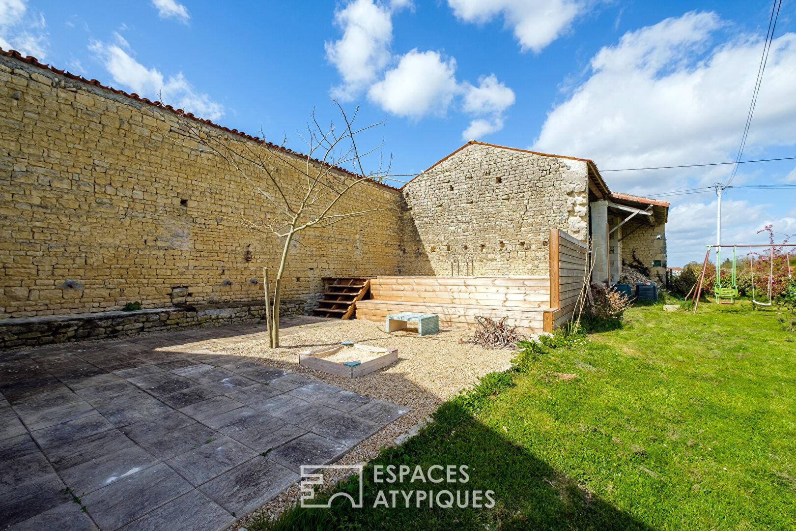 Située à Doeuil-sur-le-Mignon, à mi-chemin entre l’effervescence niortaise et la brise atlantique, cette bâtisse en pierre de pays, entièrement rénovée, développe une surface habitable de plus de 310 m2. Implantée sur une parcelle de 1 330 m2, elle conjugue charme de l’ancien et confort contemporain, offrant des volumes généreux pour une vie de famille ou un projet de résidence secondaire avec un potentiel locatif.