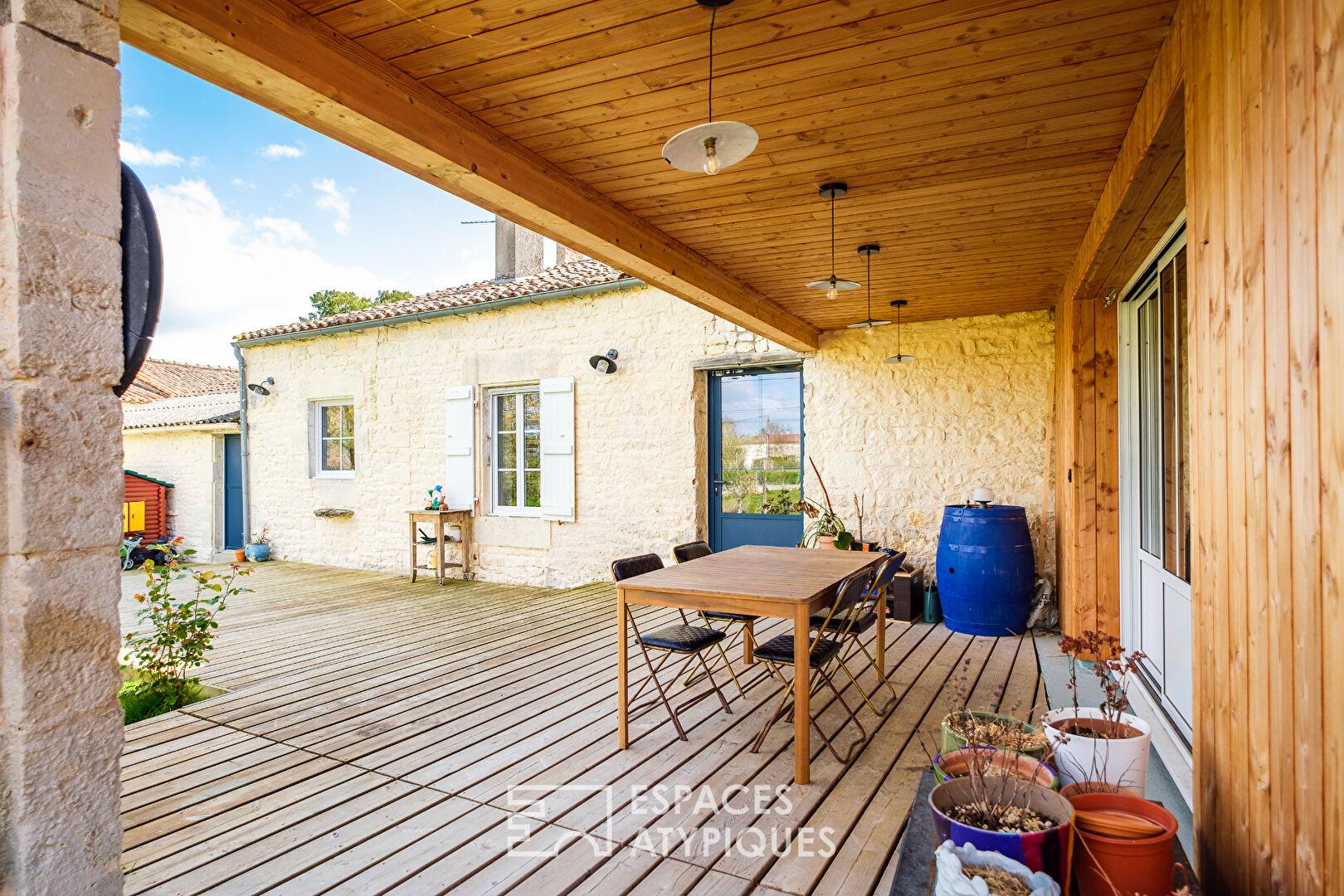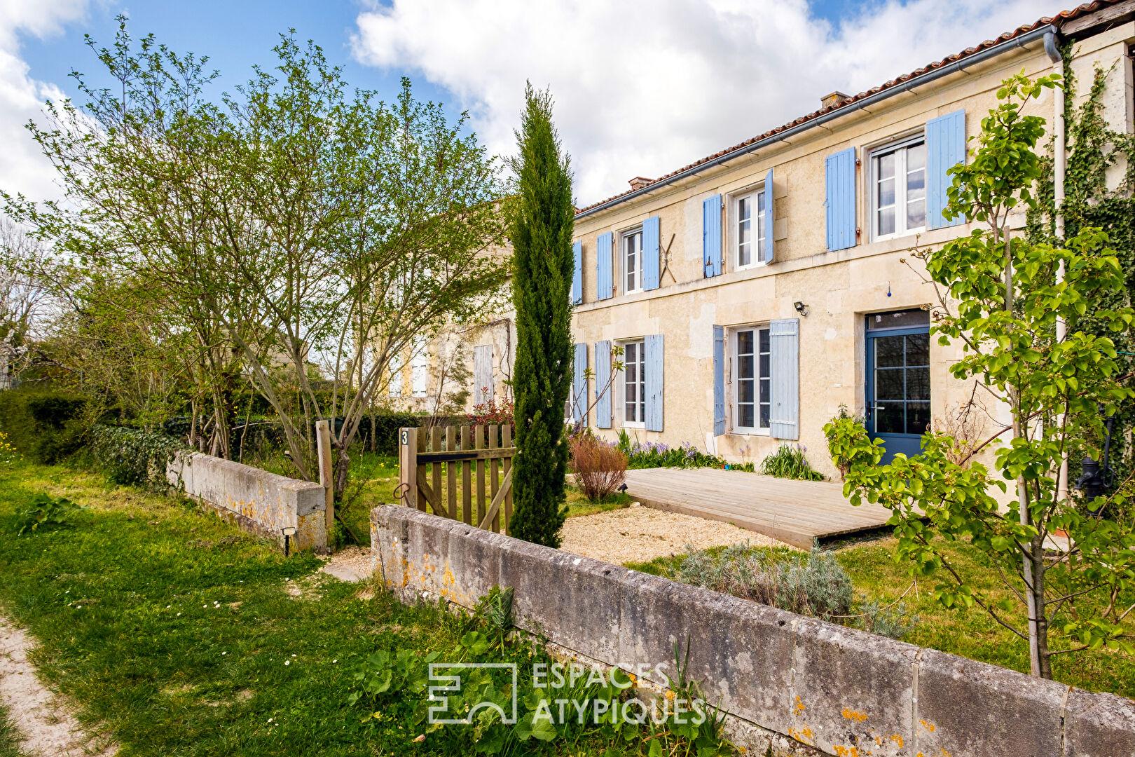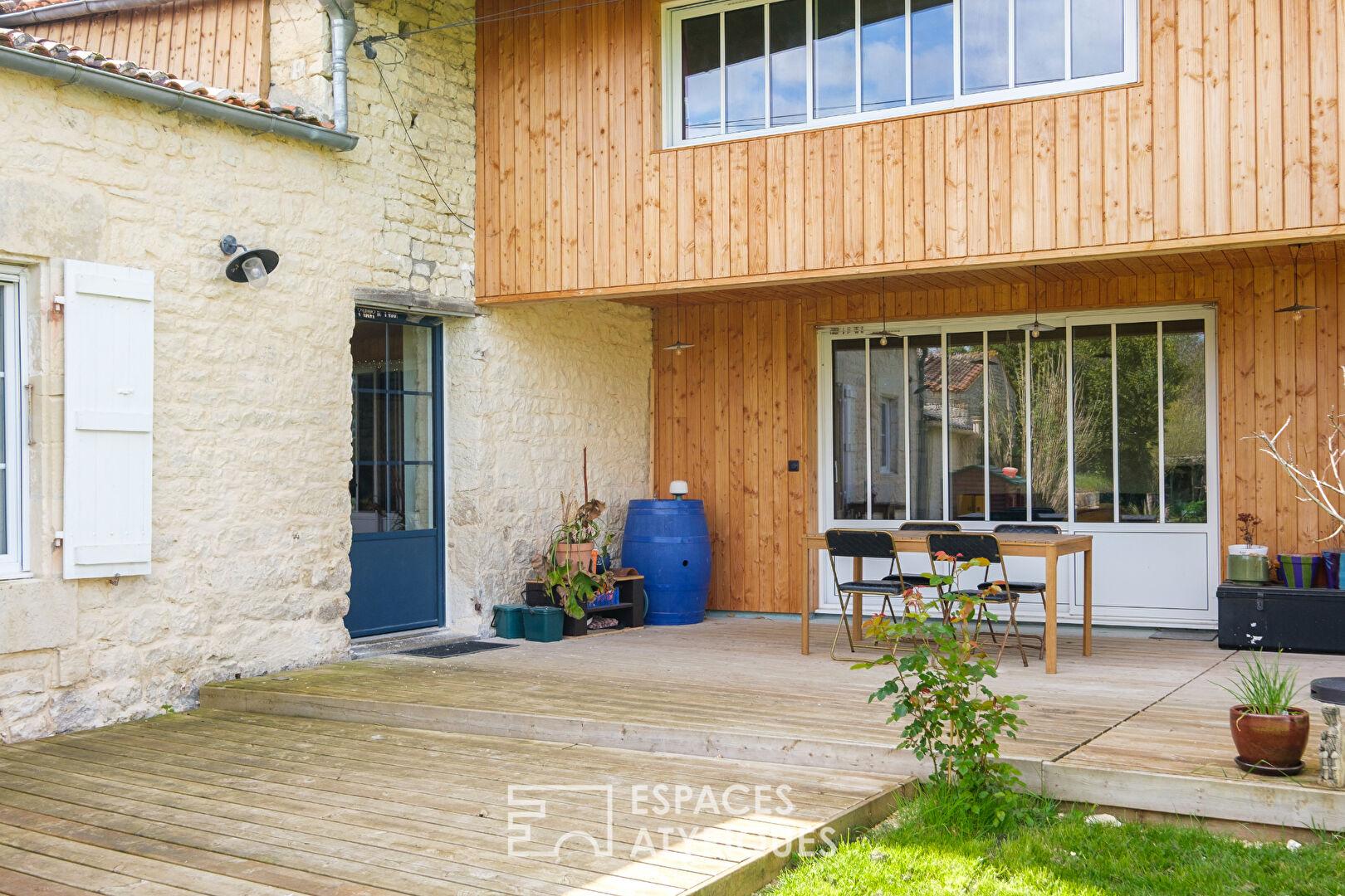 Située à Doeuil-sur-le-Mignon, à mi-chemin entre l’effervescence niortaise et la brise atlantique, cette bâtisse en pierre de pays, entièrement rénovée, développe une surface habitable de plus de 310 m2. Implantée sur une parcelle de 1 330 m2, elle conjugue charme de l’ancien et confort contemporain, offrant des volumes généreux pour une vie de famille ou un projet de résidence secondaire avec un potentiel locatif.