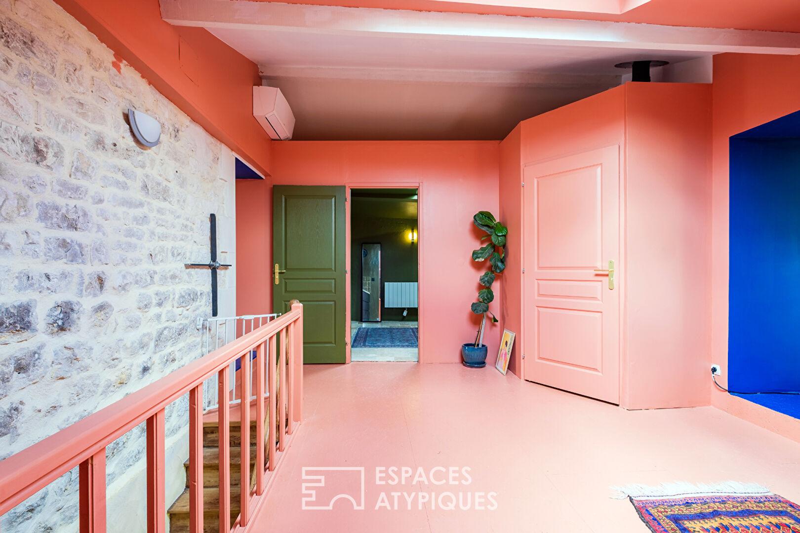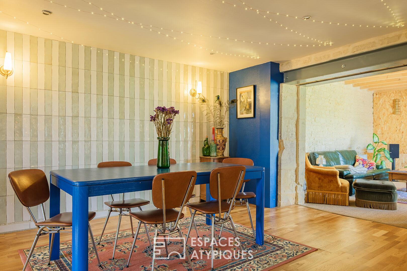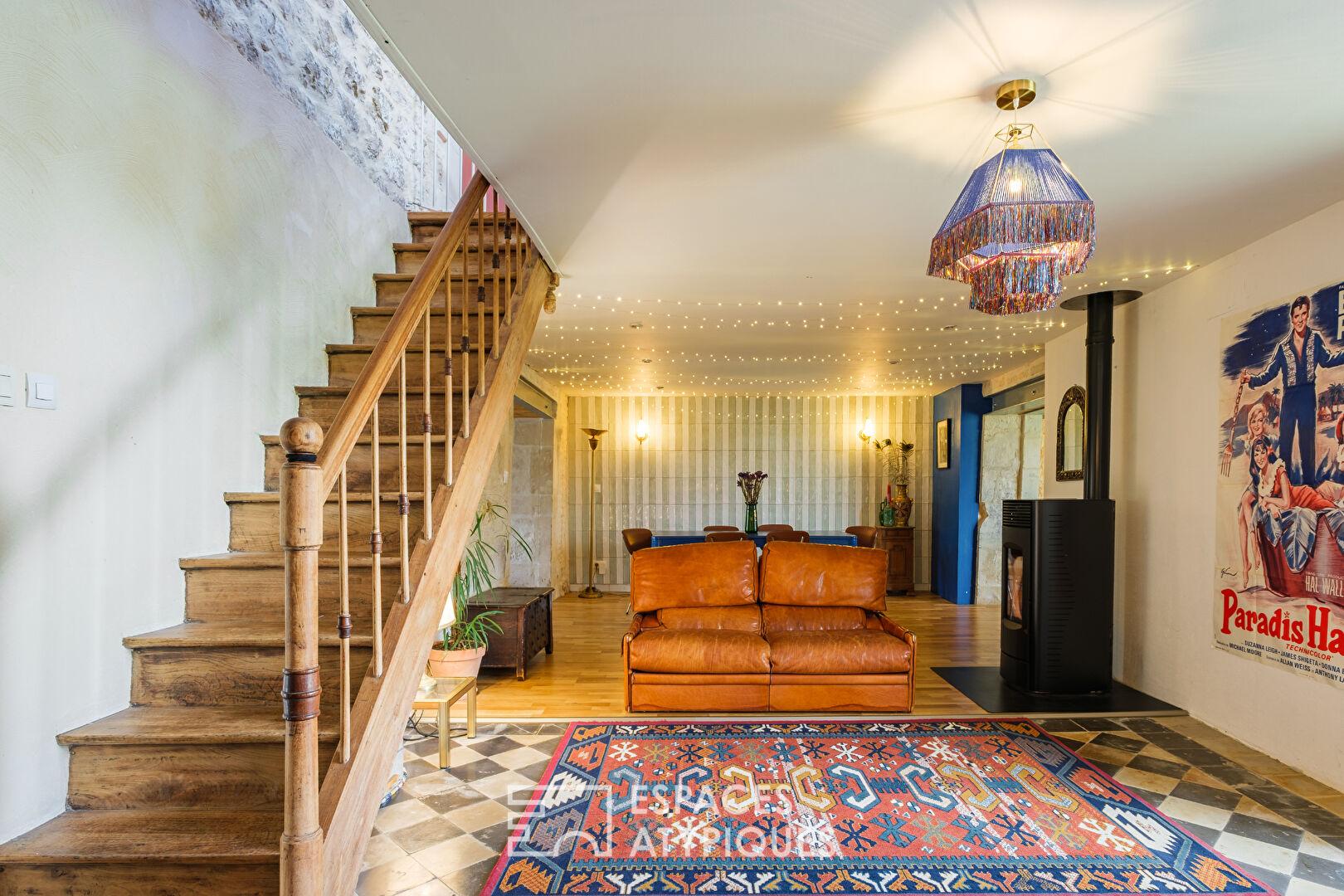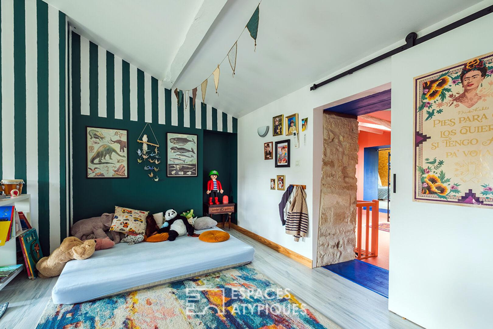 Dès l’entrée, le ton est donné à travers son vaste espace avec dressing sur mesure. La cuisine équipée, sublimée par un plan de travail en quartz et son damier noir et blanc d’origine, affirme une identité graphique forte. Elle s’ouvre sur une pièce de vie conviviale réchauffée par un poêle à granulés. D’un côté, un salon baigné de lumière grâce à de larges baies vitrées dévoile une vue apaisante sur le jardin. De l’autre, une pièce de 30 m2, aujourd’hui atelier ou salle de jeux, laisse libre cours à l’expression et se prête idéalement aux artistes comme aux entrepreneurs en quête d’inspiration.