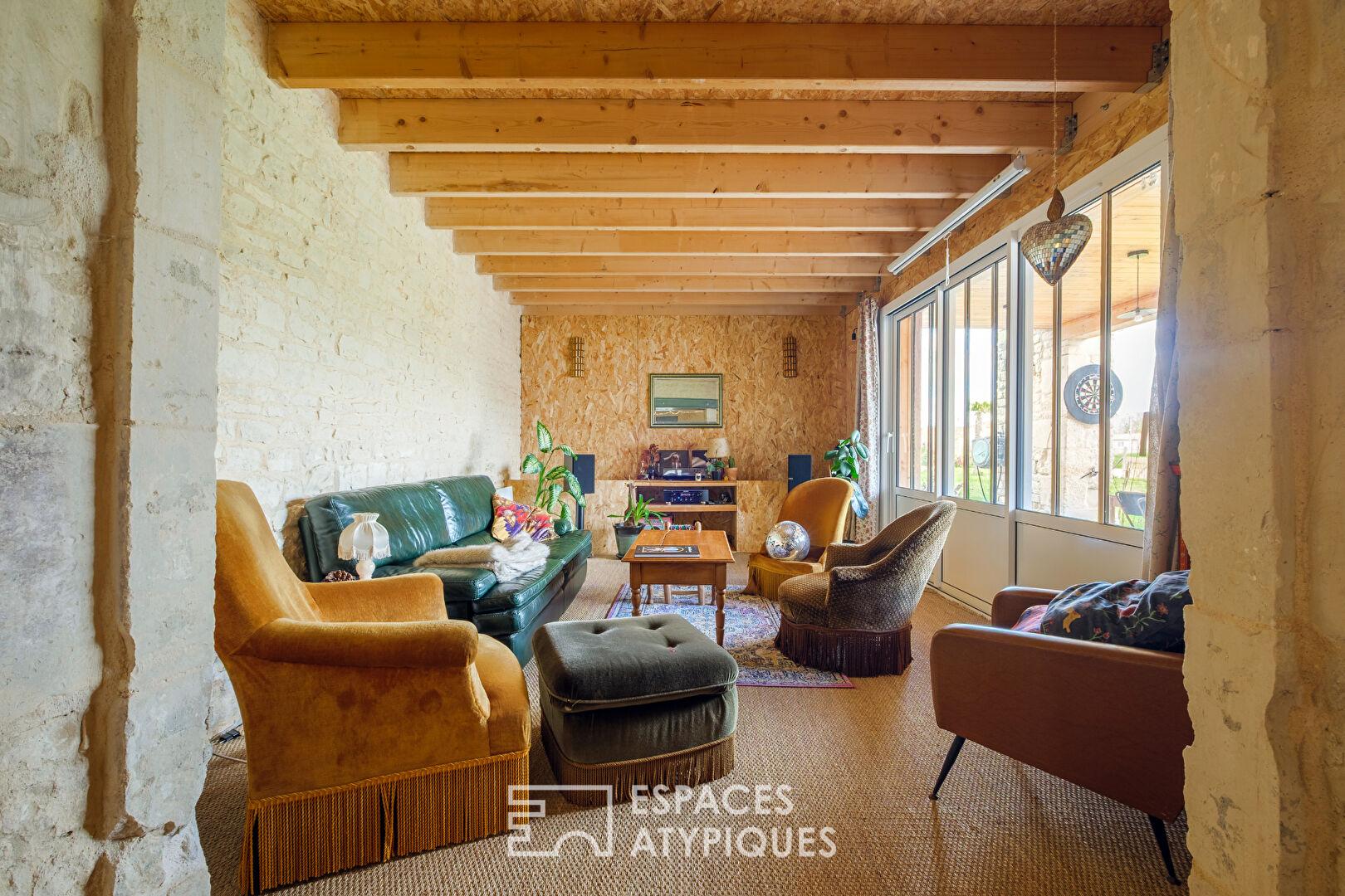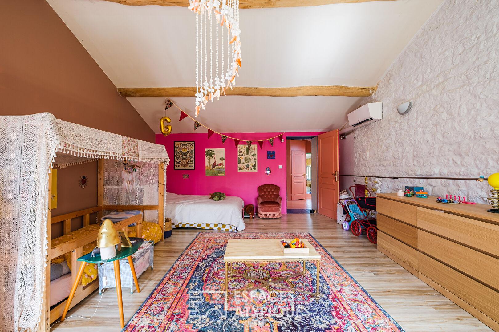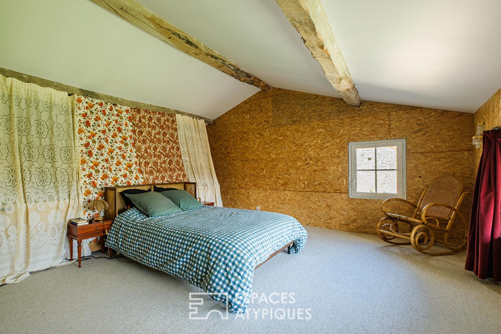 Attenant mais indépendant, un gîte de charme offre une pièce de vie, une salle d’eau et un dortoir sous les toits, idéal pour recevoir ou développer une activité d’accueil.