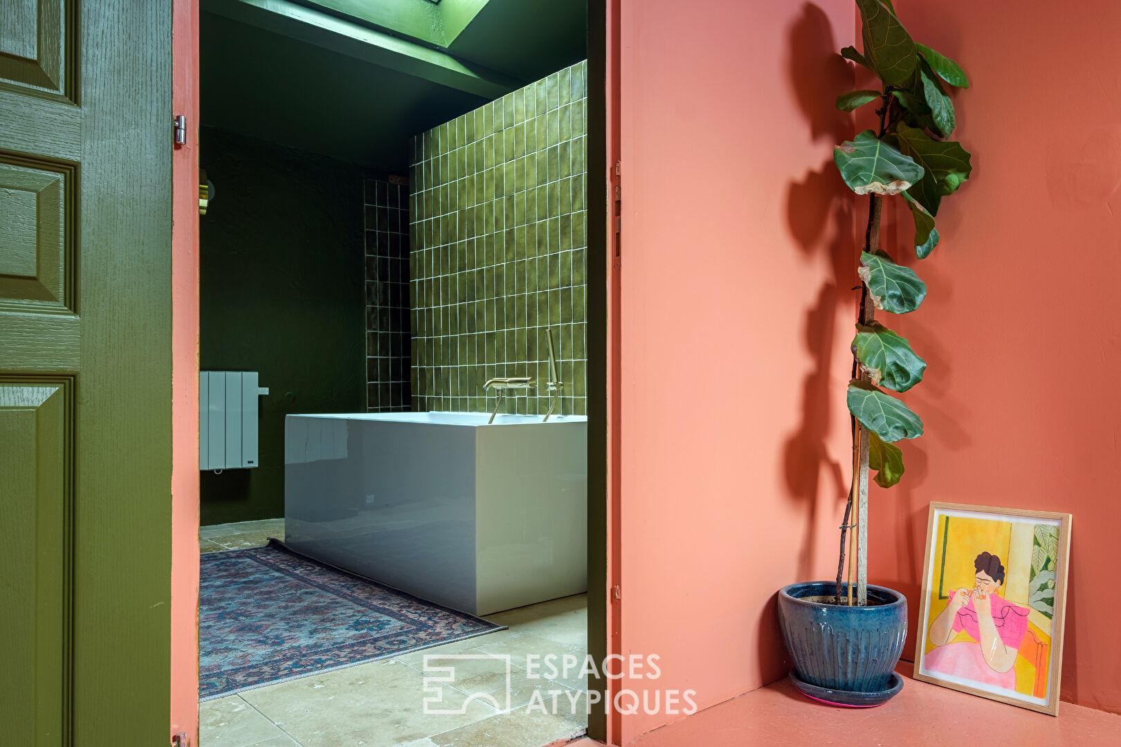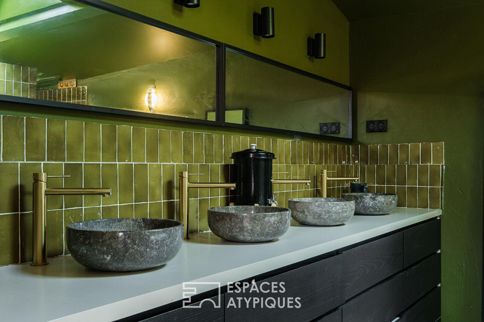 À l’étage, un large palier lumineux dessert trois confortables chambres ainsi qu’une pièce mansardée pouvant faire office de dortoir, d’espace de rangement ou de cocon intimiste. Mention spéciale pour la salle de bains : un écrin de bien-être aux tons vert forêt, mêlant robinetterie brossée, vasques en pierre, baignoire îlot sous un puits de lumière et double douche.
