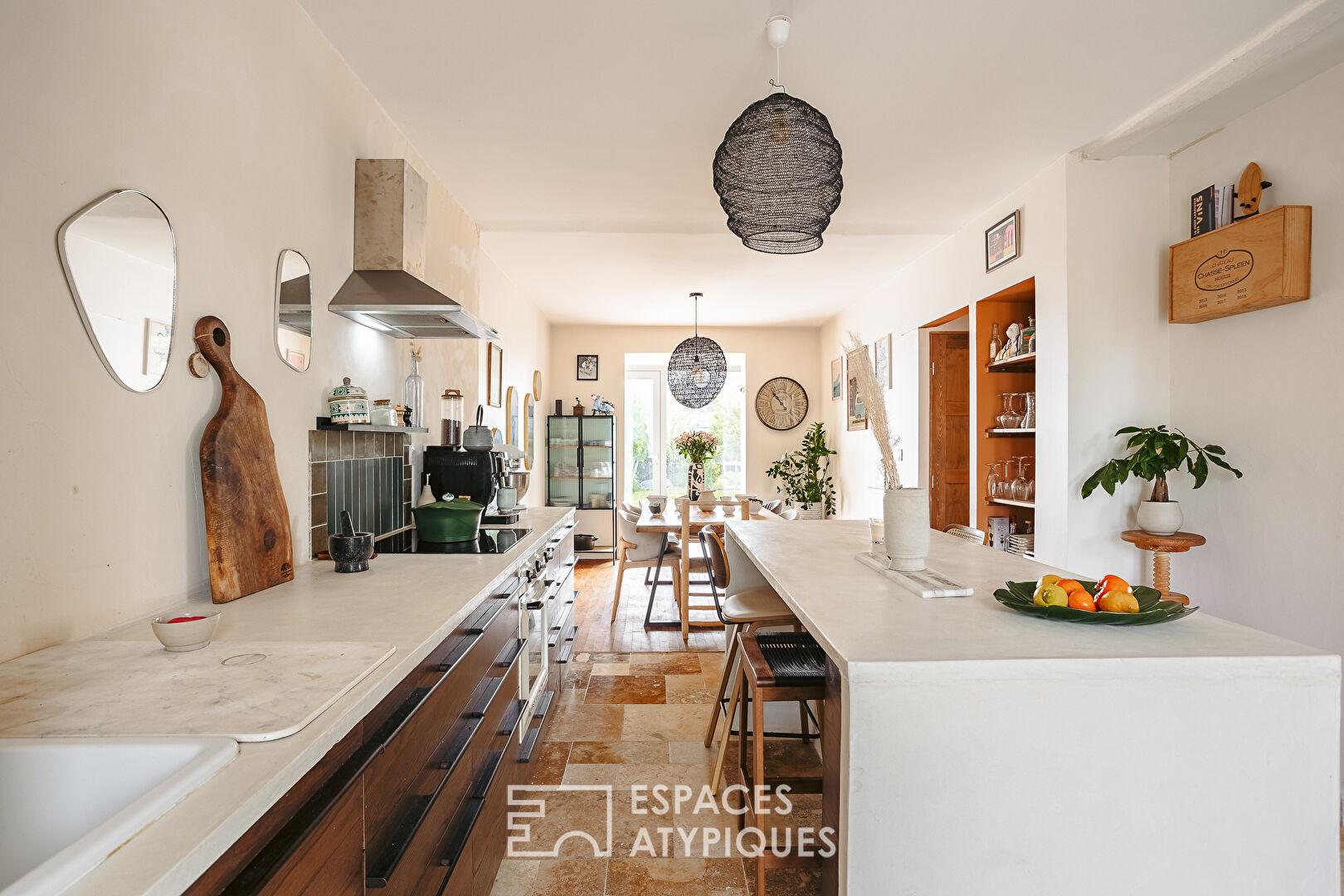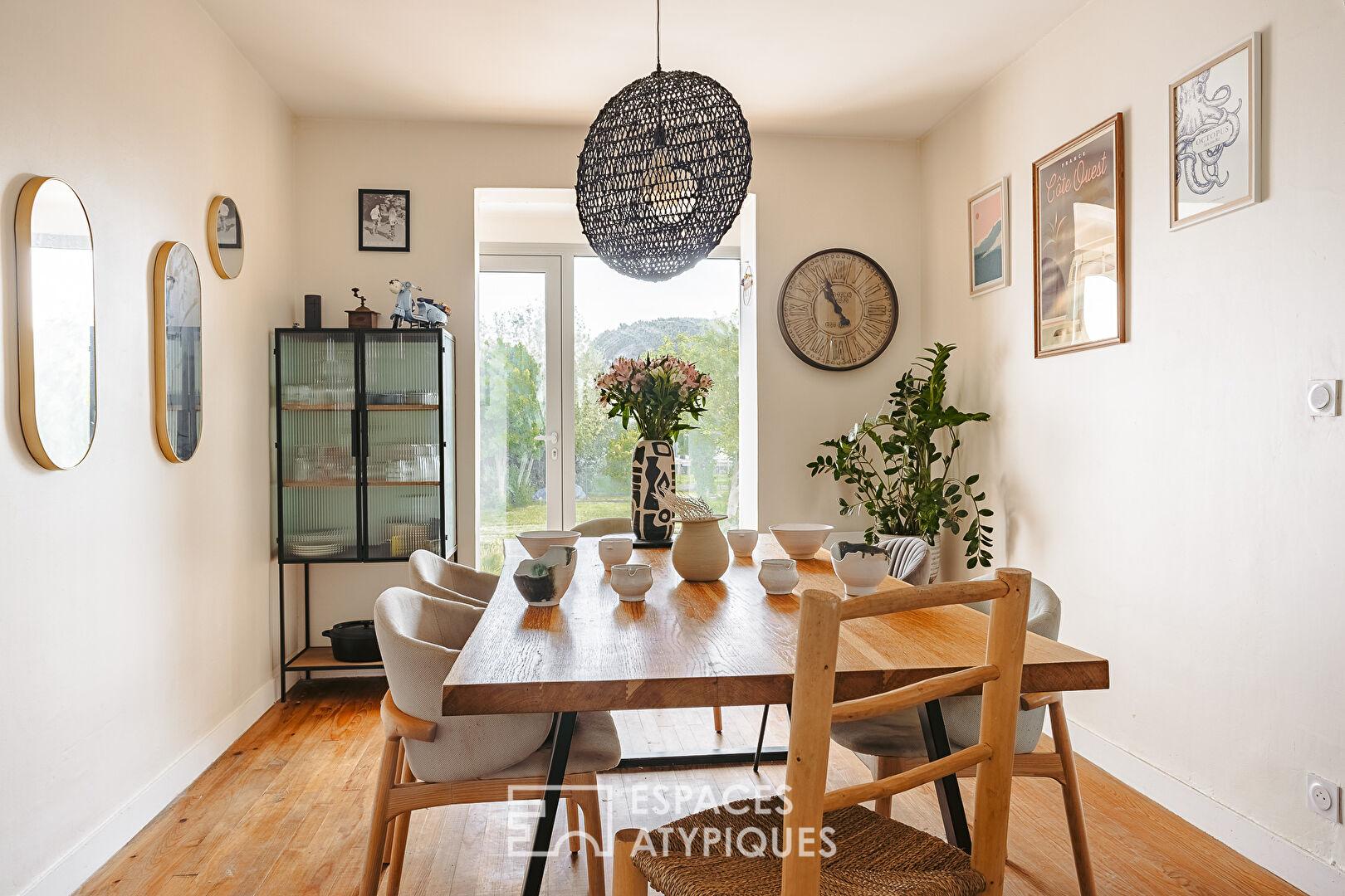 L’entrée invite à découvrir des espaces de vie fluides et baignés d’une belle lumière naturelle grâce à leur exposition Est-Ouest. Le salon, réchauffé par un poêle à bois et un séduisant parquet d’origine, affiche une atmosphère confortable et intime. Il se prolonge vers une vaste cuisine aux lignes épurées et plans de travail minéraux, véritable coeur convivial de la maison. Dans la continuité, la salle à manger s’oriente vers l’extérieur avec la piscine en perspective