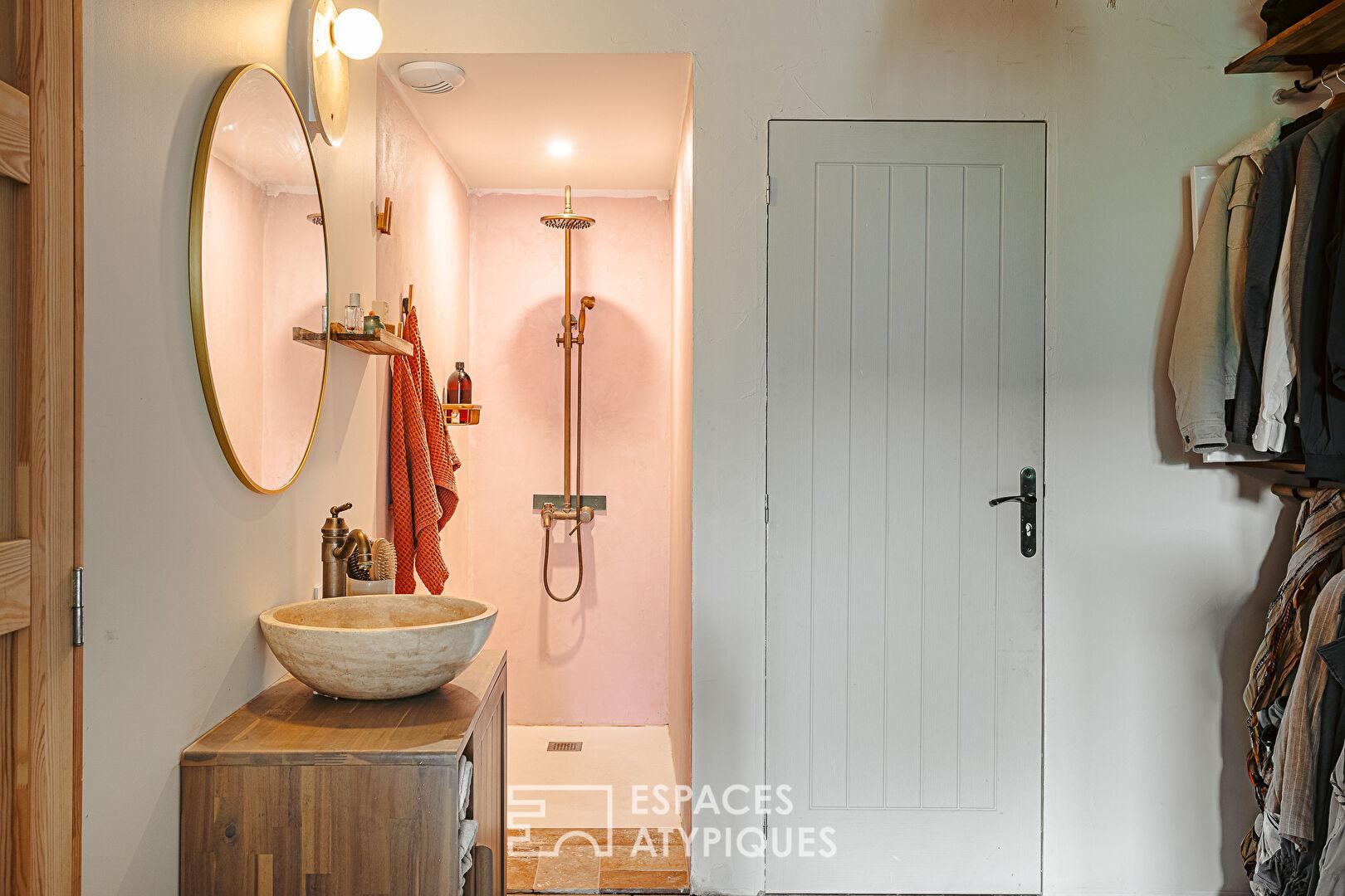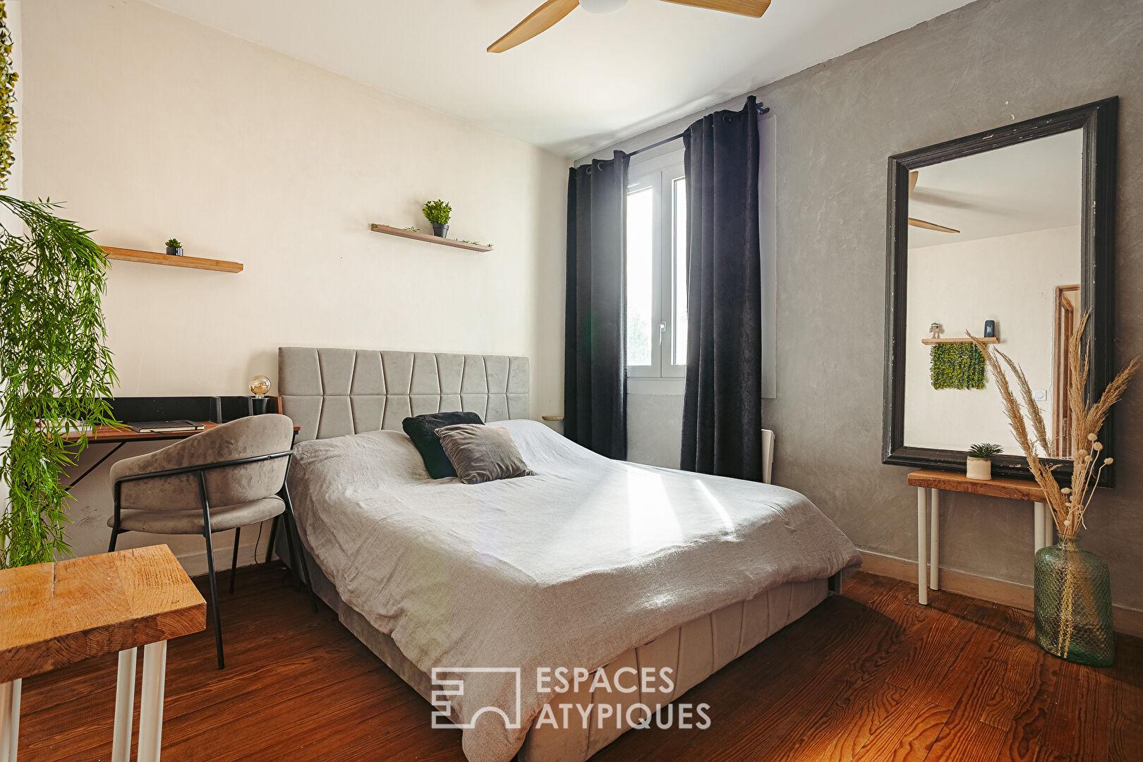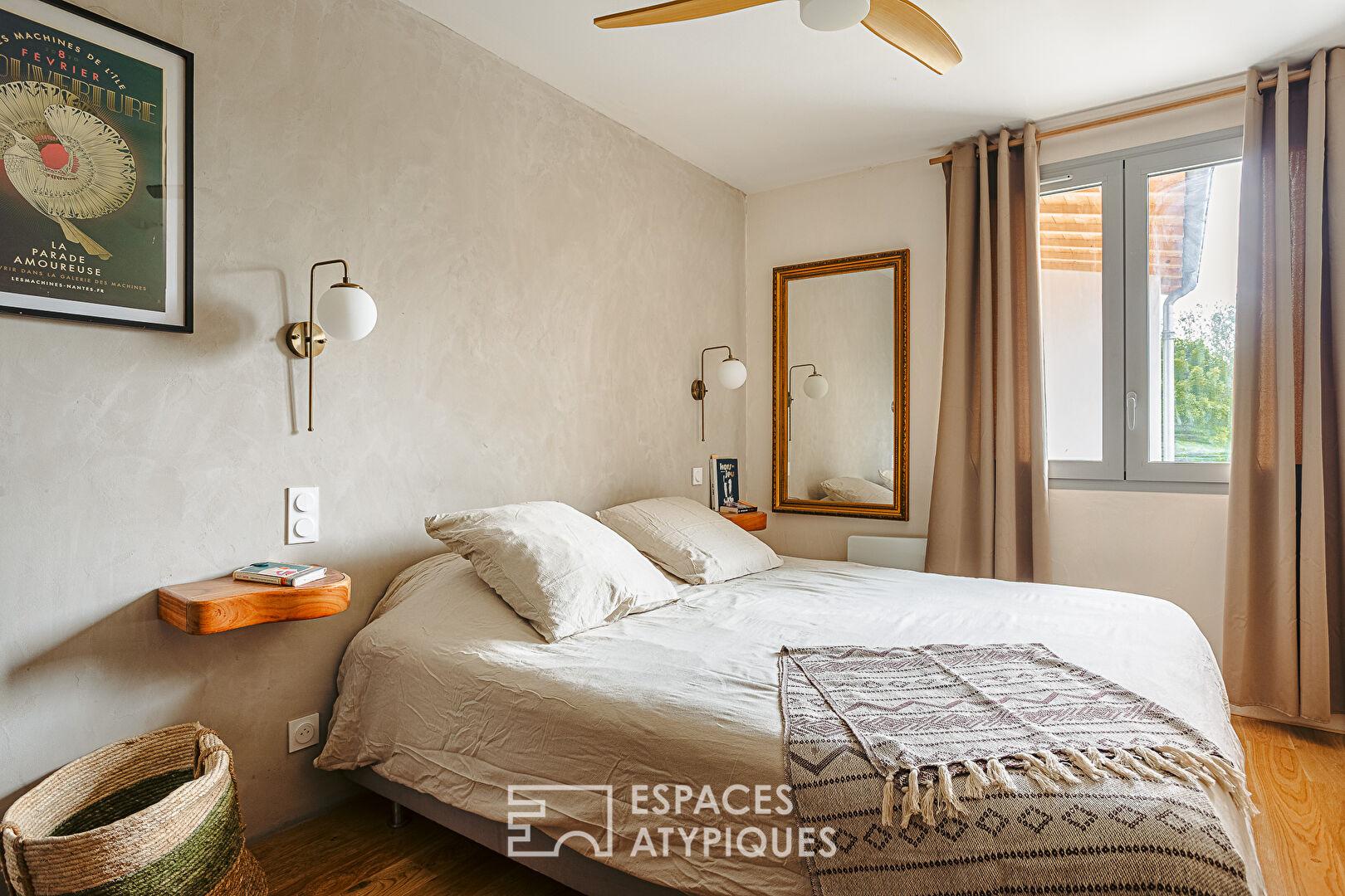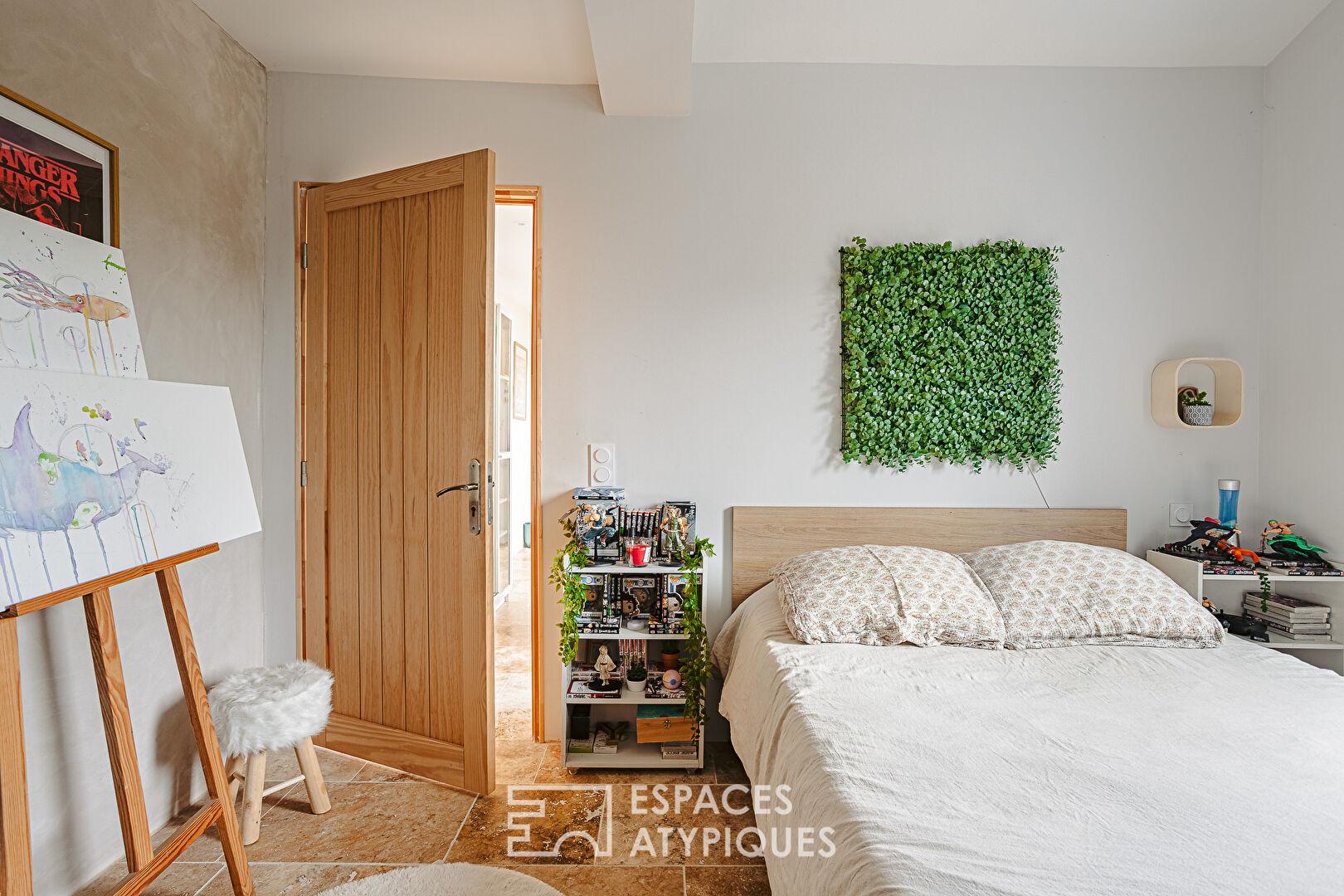 L’espace nuit est intelligemment scindé : une première aile accueille deux chambres et une salle d’eau, tandis que la seconde est dédiée à la suite parentale dotée d’un dressing, d’une salle d’eau privative et d’une vue apaisante sur le jardin. Une quatrième pièce de 16,5 m2 avec accès indépendant et mezzanine pour augmenter la surface, aujourd’hui aménagée en atelier de poterie, offre de multiples possibilités, allant de la chambre d’invités au projet locatif.