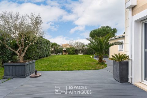 Entouré de végétation, le jardin bénéficie d’une très bonne exposition et pourrait accueillir une piscine à l’abri des regards. Aujourd’hui c’est une grande terrasse et un barbecue qui assurent la convivialité aux beaux jours.