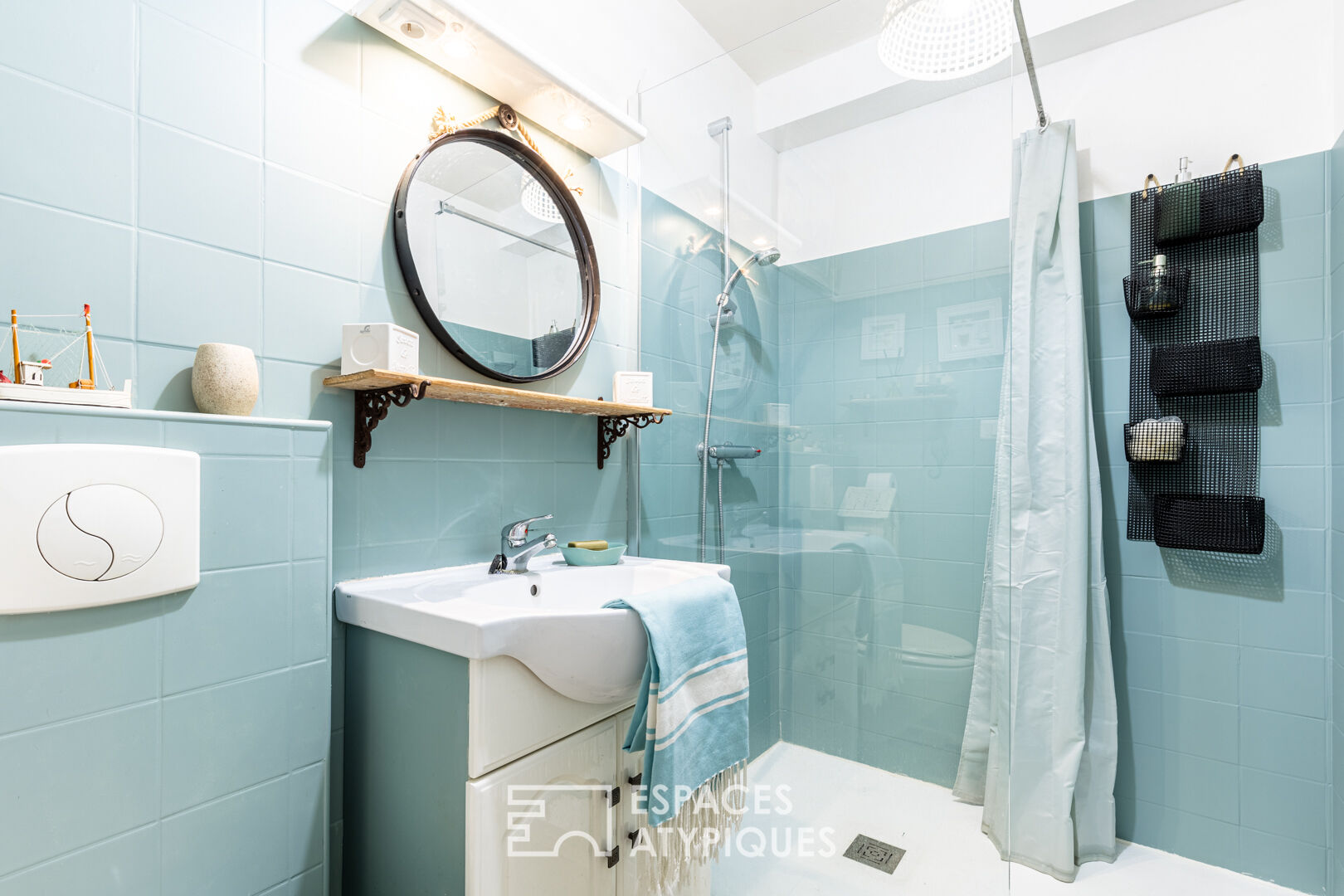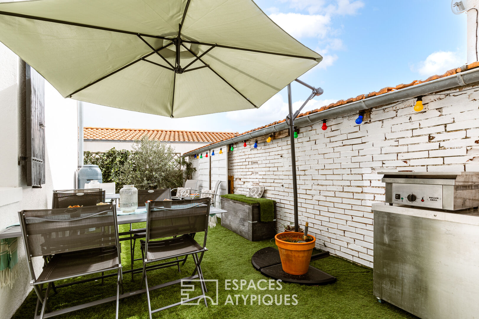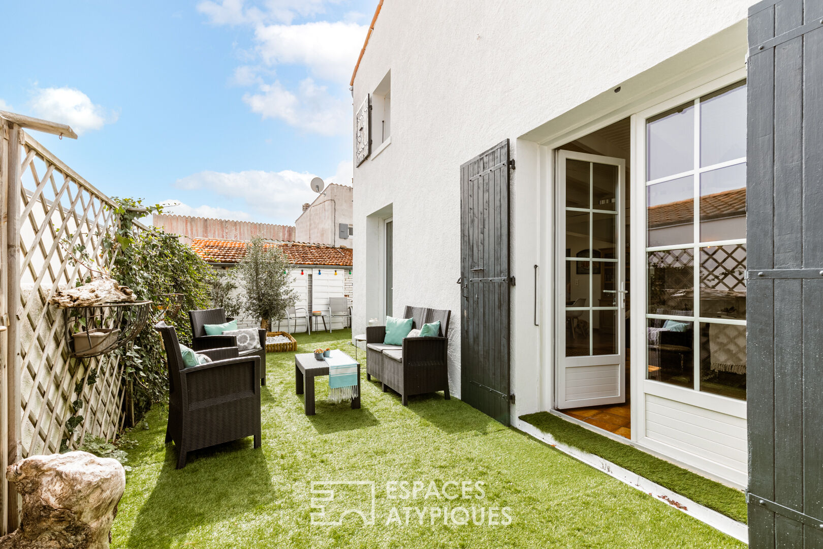 Située dans le sud de l’île, à Saint-Trojan-Les-Bains, commune emblématique depuis les années 1900 pour ses villas d’époque, sa forêt domaniale et ses plages, cette maison de village d’environ 128 m2, implantée sur une parcelle de 130 m2, apparait comme une maison romantique dès l’entrée, comme insufflée des villas à la Hemingway.