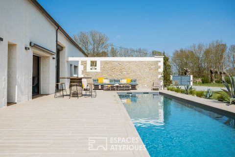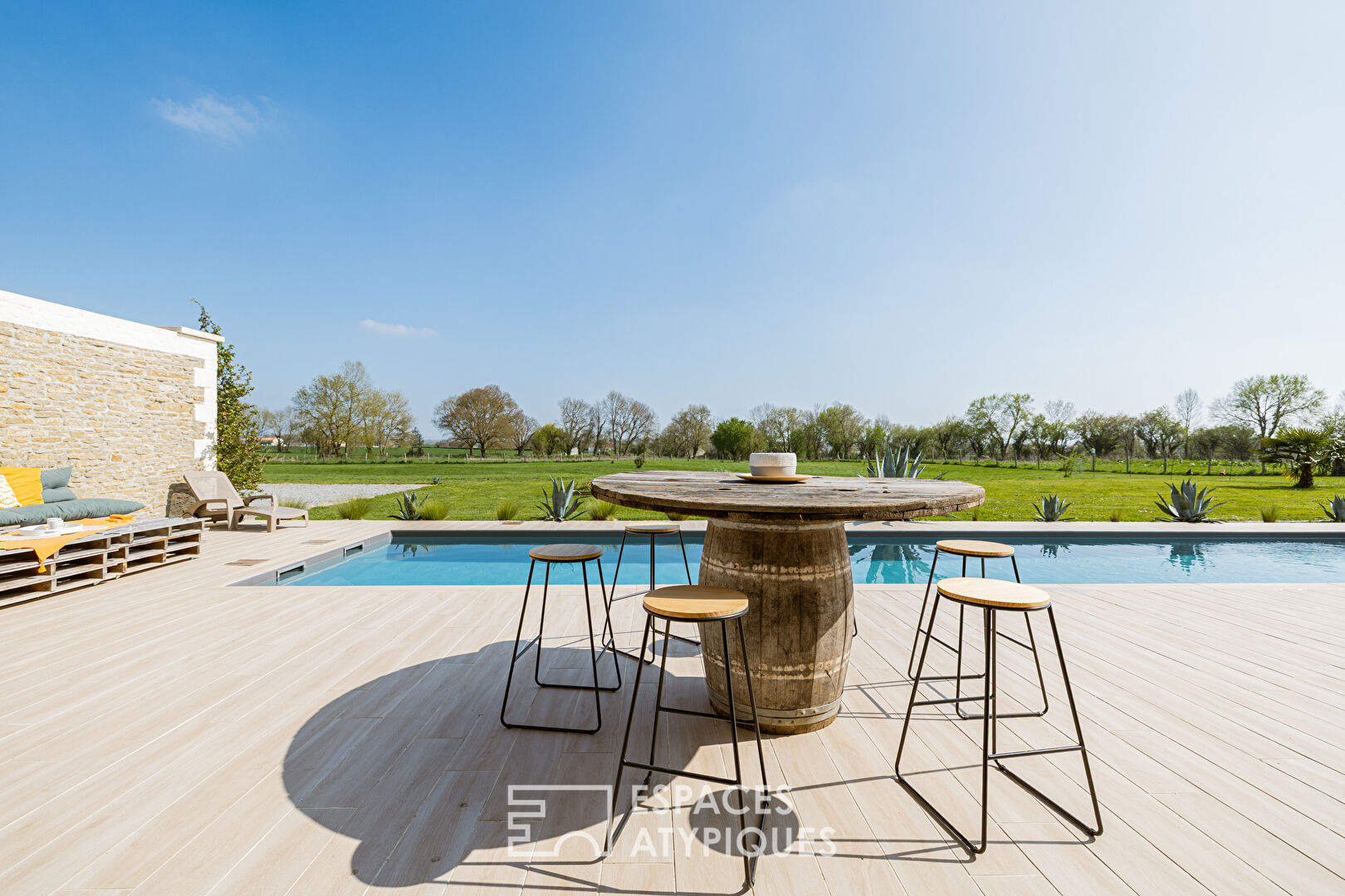 La terrasse et la piscine à effet couloir de nage offrent une vue imprenable sur les étendues verdoyantes, une véritable invitation à la contemplation.