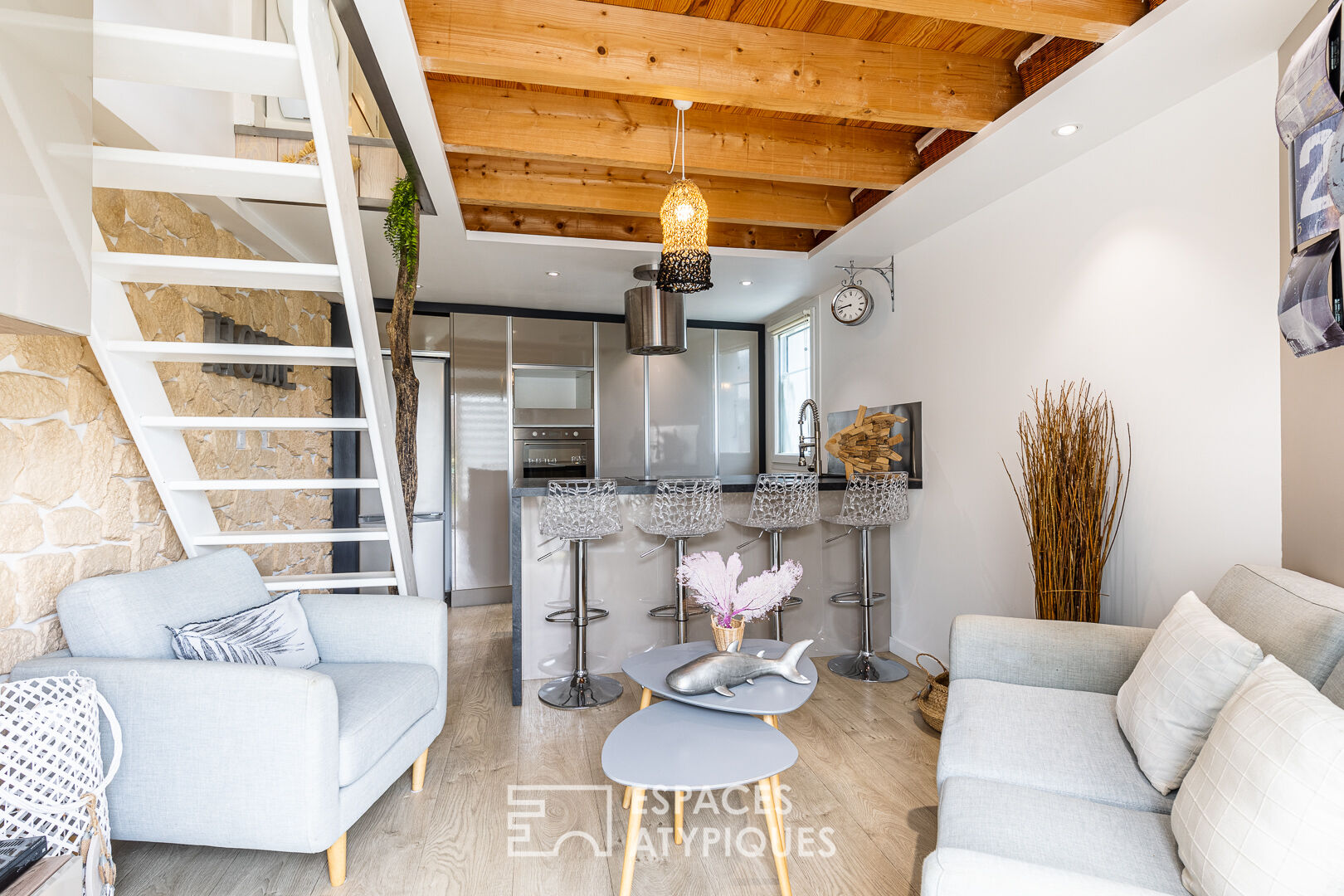 La première maison, offrant 34 m2 habitables environ, dispose au rez-de-chaussée d’une petite pièce à vivre avec sa cuisine équipée, agrémentée de son comptoir bar, se prolongeant sur un espace salon. A l’étage, une chambre est conçue comme un cocon et profite d’une salle d’eau et d’un toilette séparé.
