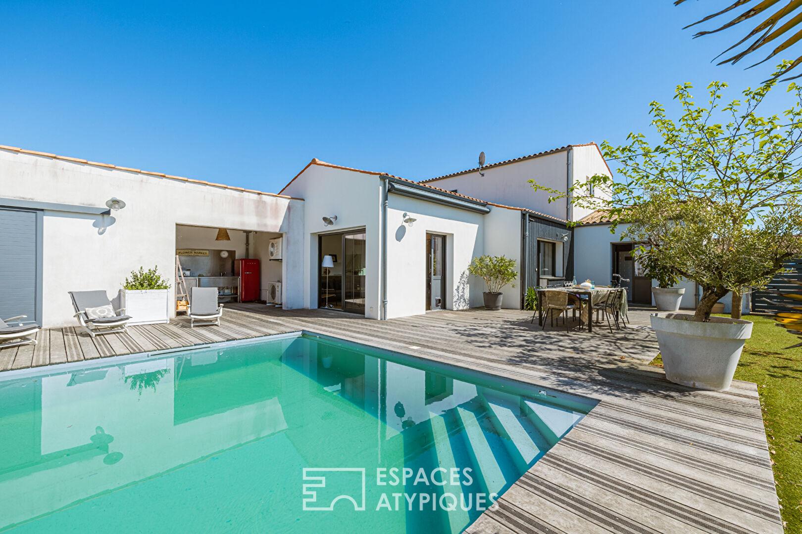 Derrière son portail, la magie opère immédiatement. Le regard se laisse happer par la perspective d’un jardin intimiste, délicatement structuré, où la piscine chauffée scintille sous la lumière. Véritable prolongement de l’art de vivre, la cuisine d’été, avec son espace barbecue et son point d’eau, devient le théâtre de soirées infinies, rythmées par les rires, les parfums d’été et la douceur des nuits étoilées.