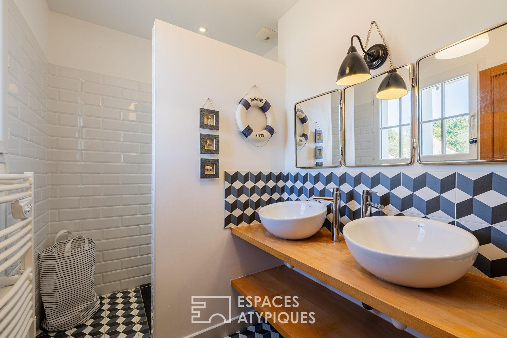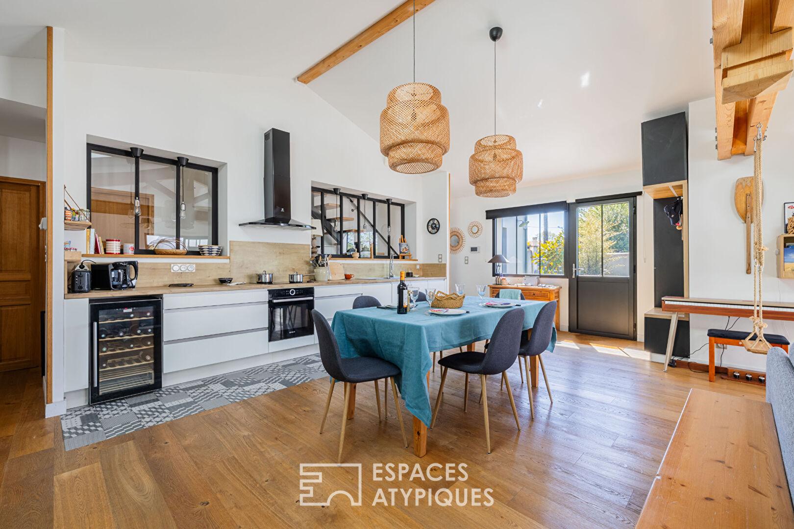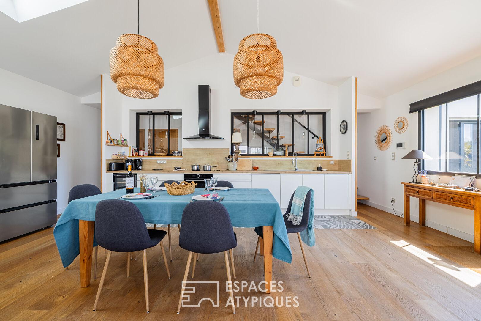 La villa s’ouvre sur une pièce de vie baignée de lumière, sublimée par une exposition sud-est qui accompagne chaque moment de la journée. La cuisine, élégamment aménagée et parfaitement équipée, s’impose comme un espace de partage et de création. Ses baies esprit atelier laissent subtilement entrevoir l’envolée de l’escalier, apportant caractère et perspective à l’ensemble, où fonctionnalité et esthétisme dialoguent avec justesse. En retrait, un espace cellier, buanderie et chaufferie complète avec discrétion cet ensemble harmonieux.