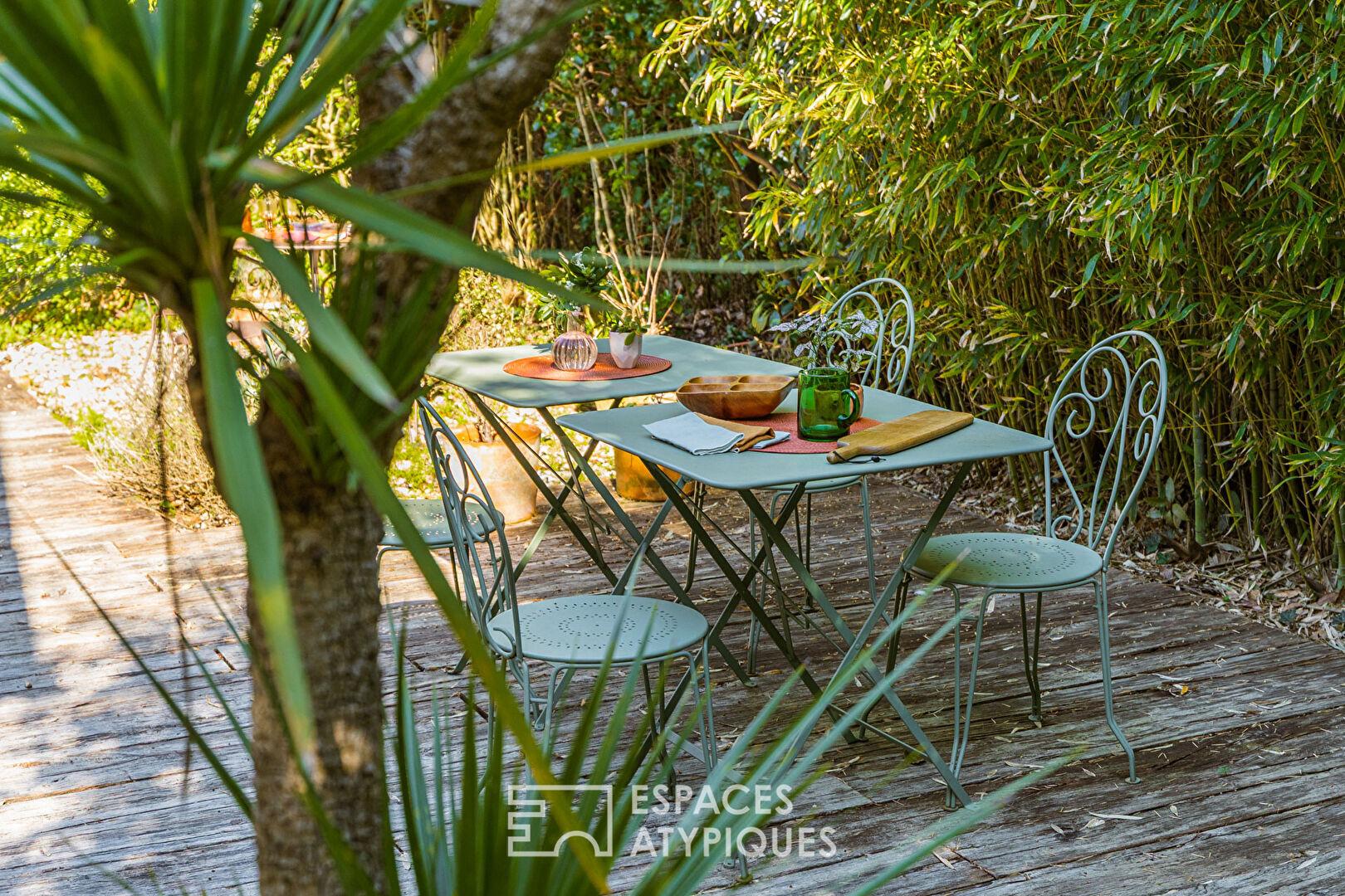 À l’extérieur, les terrasses en traverses de bois massif dessinent plusieurs espaces de vie intimistes, parfaits pour profiter des journées estivales. Le jardin, imaginé et réalisé par la société « Jardin et Espaces », s’apparente à une véritable oasis végétale où le rythme des saisons s’exprime à travers une palette de fleurs, de plantes persistantes et d’essences soigneusement choisies, complété par un espace potager.