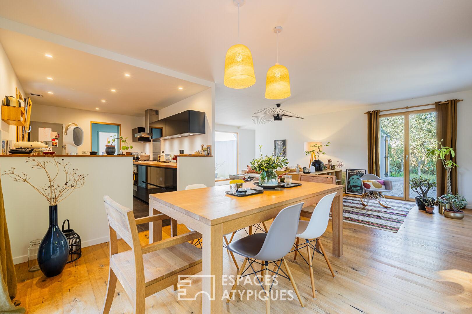 Baignée par une triple exposition, la pièce de vie révèle la qualité des prestations : parquet massif chaleureux et menuiseries en aluminium aux profils bois côté espaces de vie, conjuguant esthétique et performance. La sélection des matières et des matériaux confère à l’ensemble une ambiance feutrée et raffinée, où chaque détail participe à l’harmonie générale. Les larges ouvertures prolongent naturellement la maison vers le jardin, dévoilant au fil des saisons un décor verdoyant et apaisant.