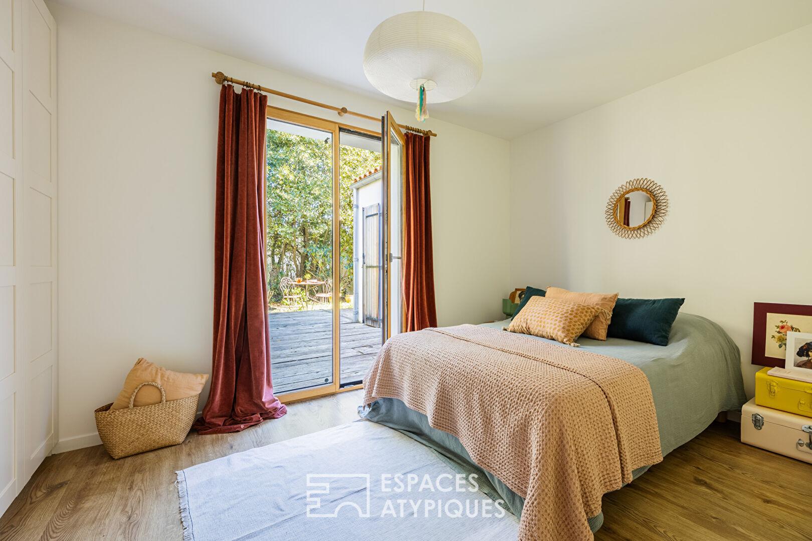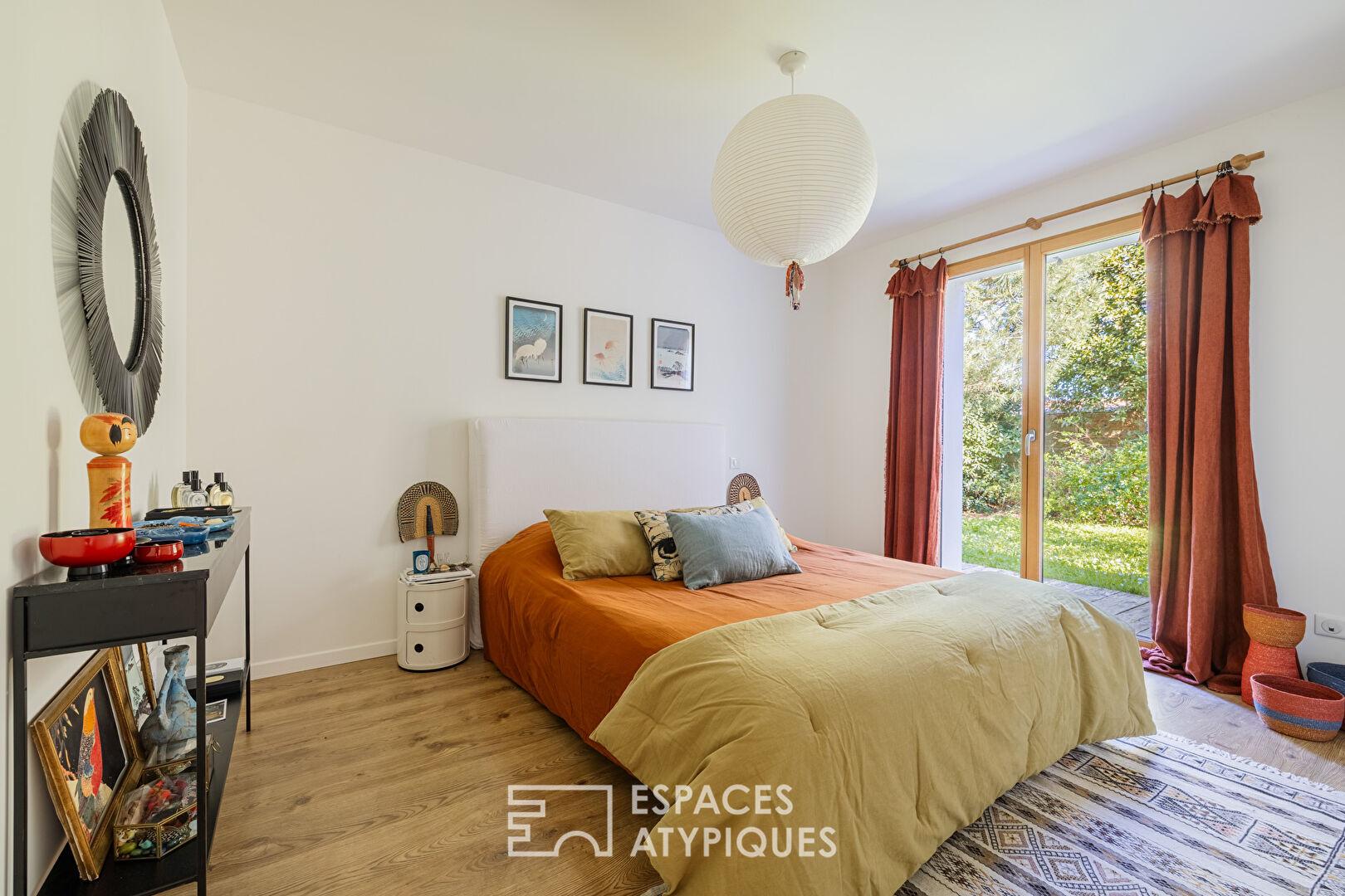 L’aile droite accueille deux chambres, dont une élégante suite parentale agrémentée d’un dressing aménagé et équipé. Chacune bénéficie d’un accès direct aux terrasses, prolongeant la sensation d’ouverture vers le jardin. Une salle d’eau et un toilette indépendant complètent cette première partie.