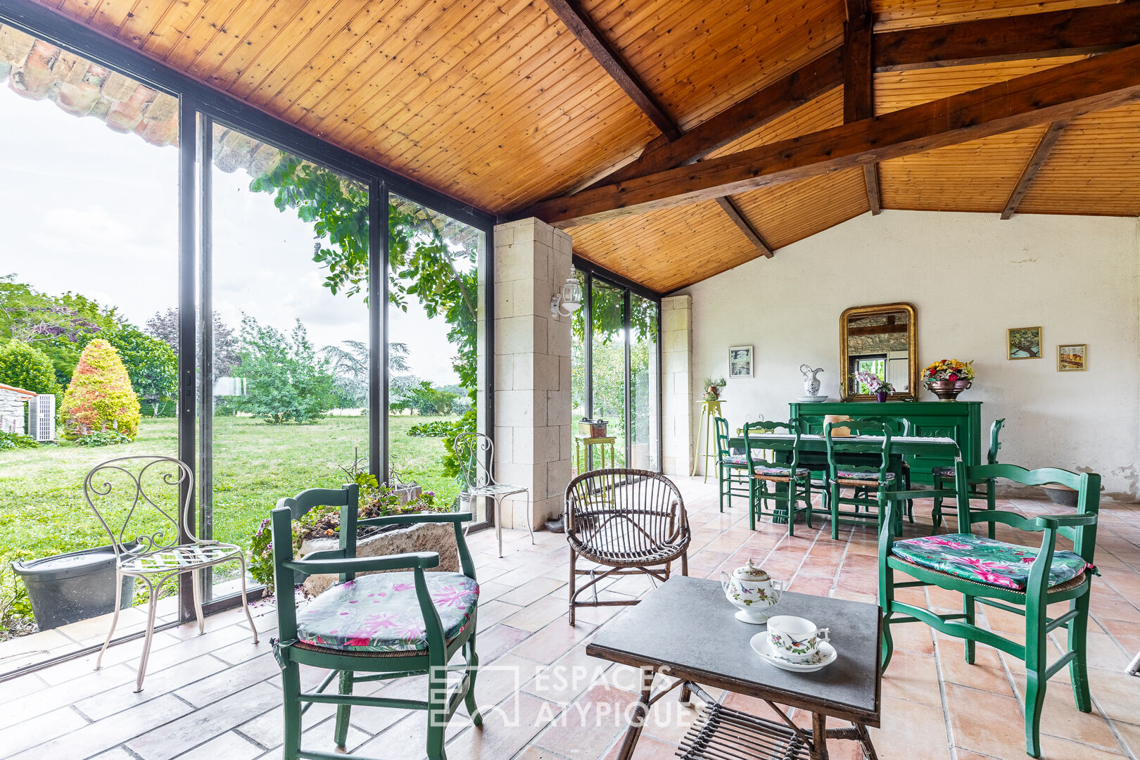 Dans l’aile droite, la pièce de vie avec sa cheminée en pierre de taille trônant au centre de la pièce donne l’impression que le temps s’est arrêté, à l’abri des tumultes de la vie. Elle rejoint une véranda de 46m2 avec vue sur le parc arboré, l’endroit idéal pour rassembler