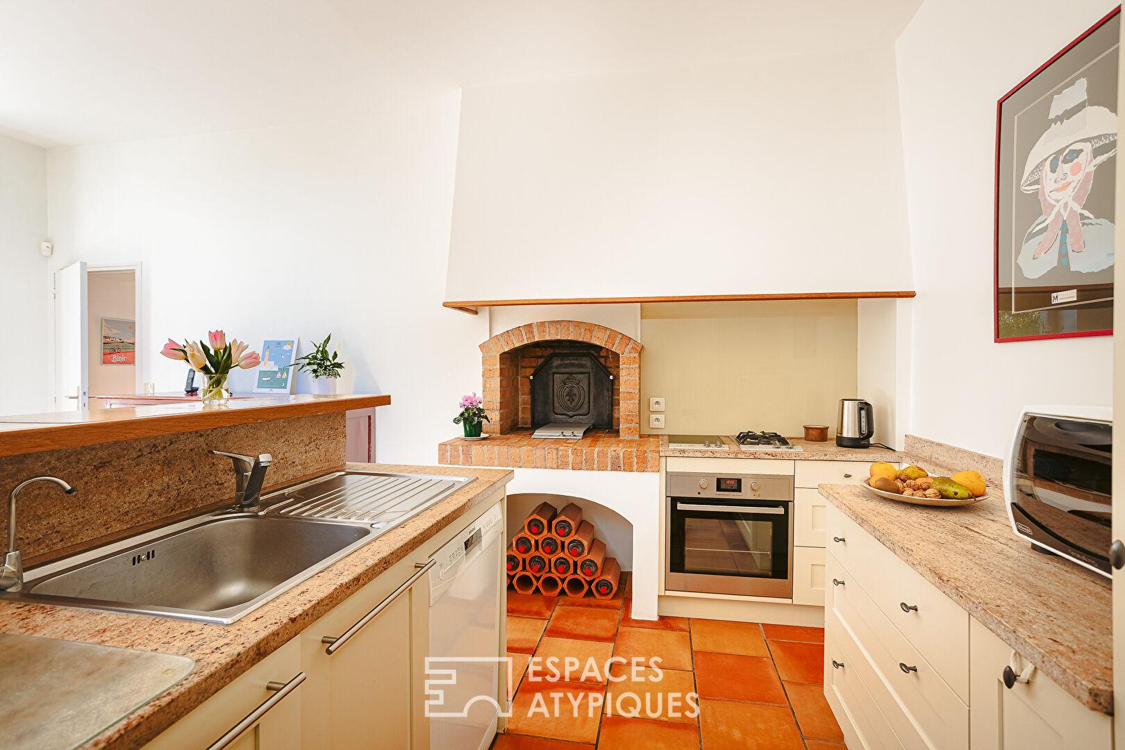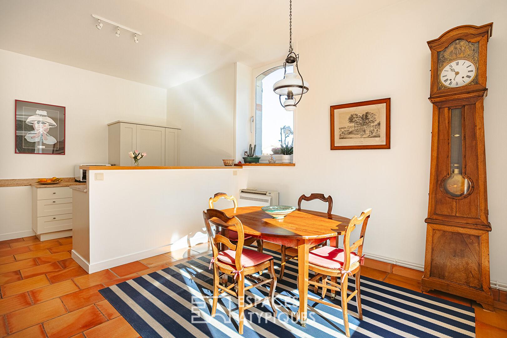 L’entrée, subtilement protégée par un préau, s’ouvre sur un séjour spacieux et lumineux, éclairé grâce à ses grandes ouvertures exposées au Sud et à l’Est. Les tomettes anciennes et les poutres apparentes dialoguent harmonieusement avec une imposante cheminée en pierre. Semi-ouverte avec la pièce de vie, la salle à manger profite elle aussi d’une grande ouverture sur le jardin. Un dégagement qui dessert l’escalier et un cellier-buanderie mène à la cuisine. D’une superficie d’environ 24 m2, elle se distingue par son coin repas, ses vastes surfaces de travail et ses équipements originaux, dont un grill directement intégré à la cheminée.