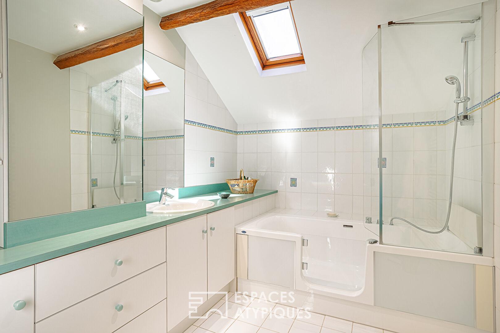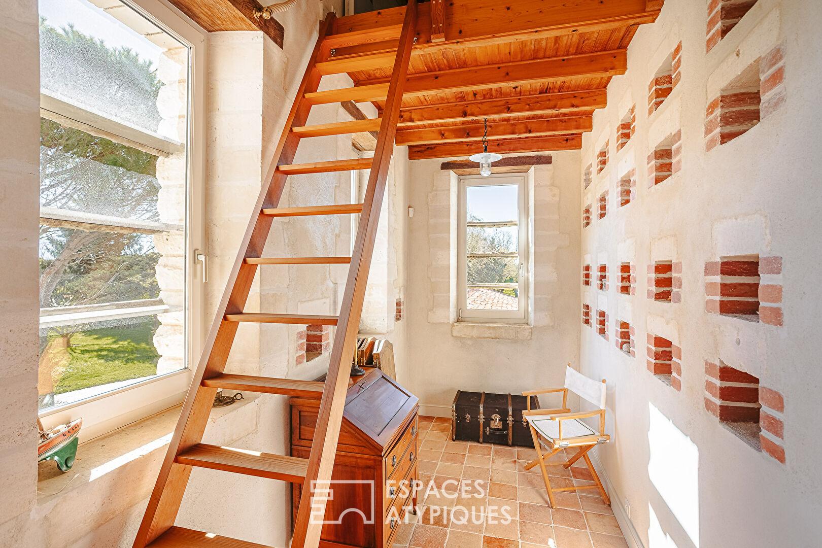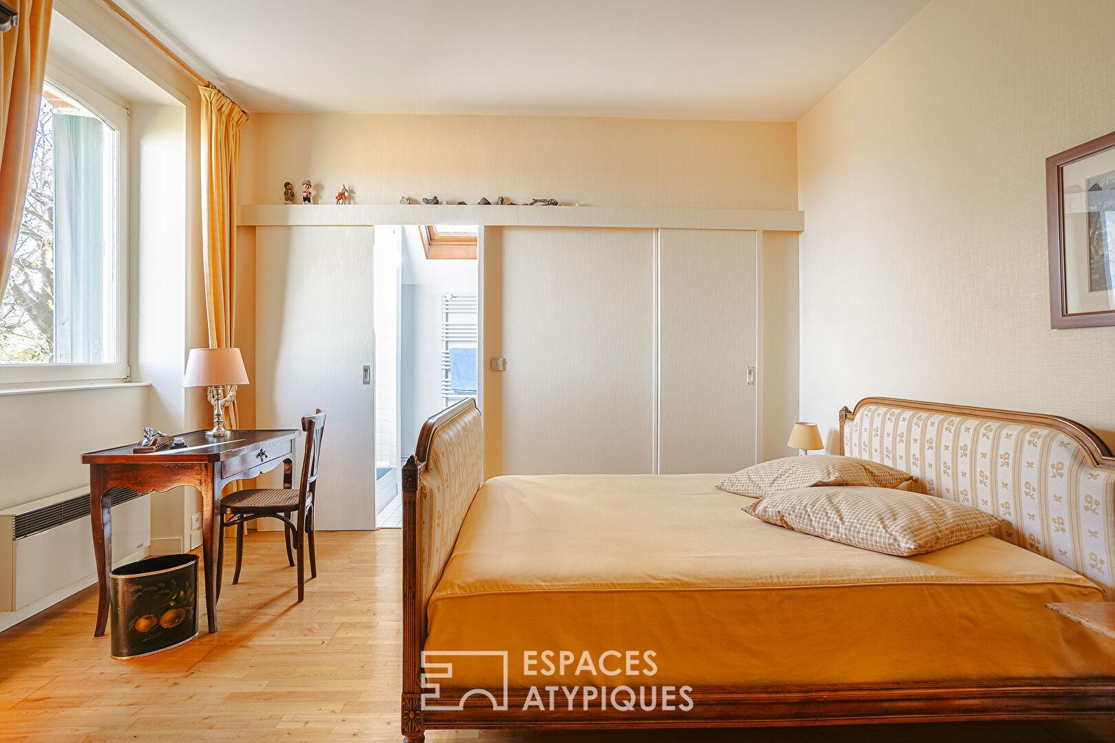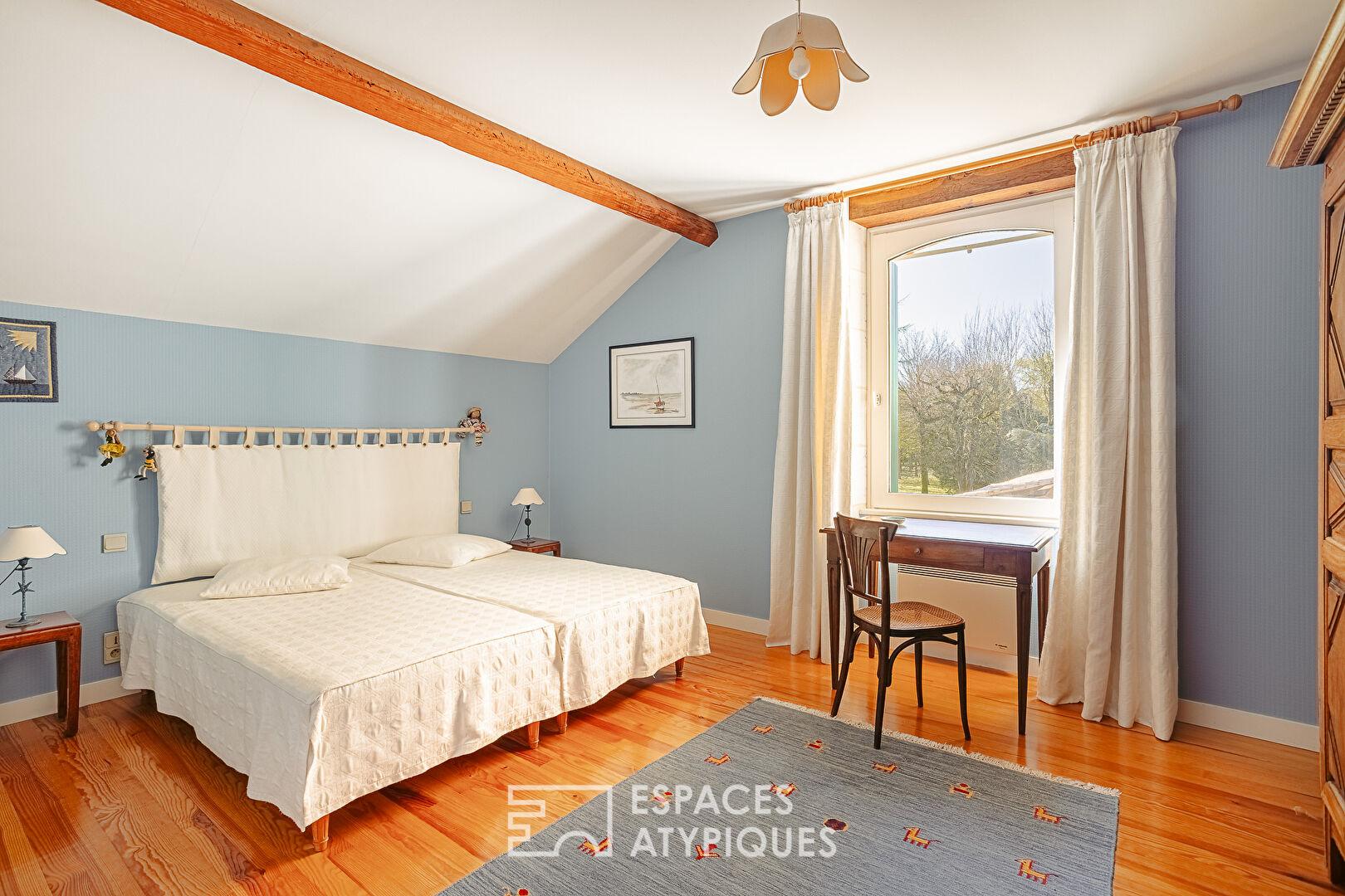 À l’étage, le parquet chaleureux distribue trois chambres accueillantes : une suite avec dressing et salle d’eau, une chambre centrale généreuse orientée vers la végétation, et une troisième chambre dotée d’un coin bureau. Une salle de bains familiale complète l’étage, accessible depuis le palier. Insolite, la quatrième chambre occupe l’ancien pigeonnier de la propriété. Elle charme par ses pierres apparentes, ses nichoirs en briques préservés et sa mezzanine, qui ravira les plus jeunes.