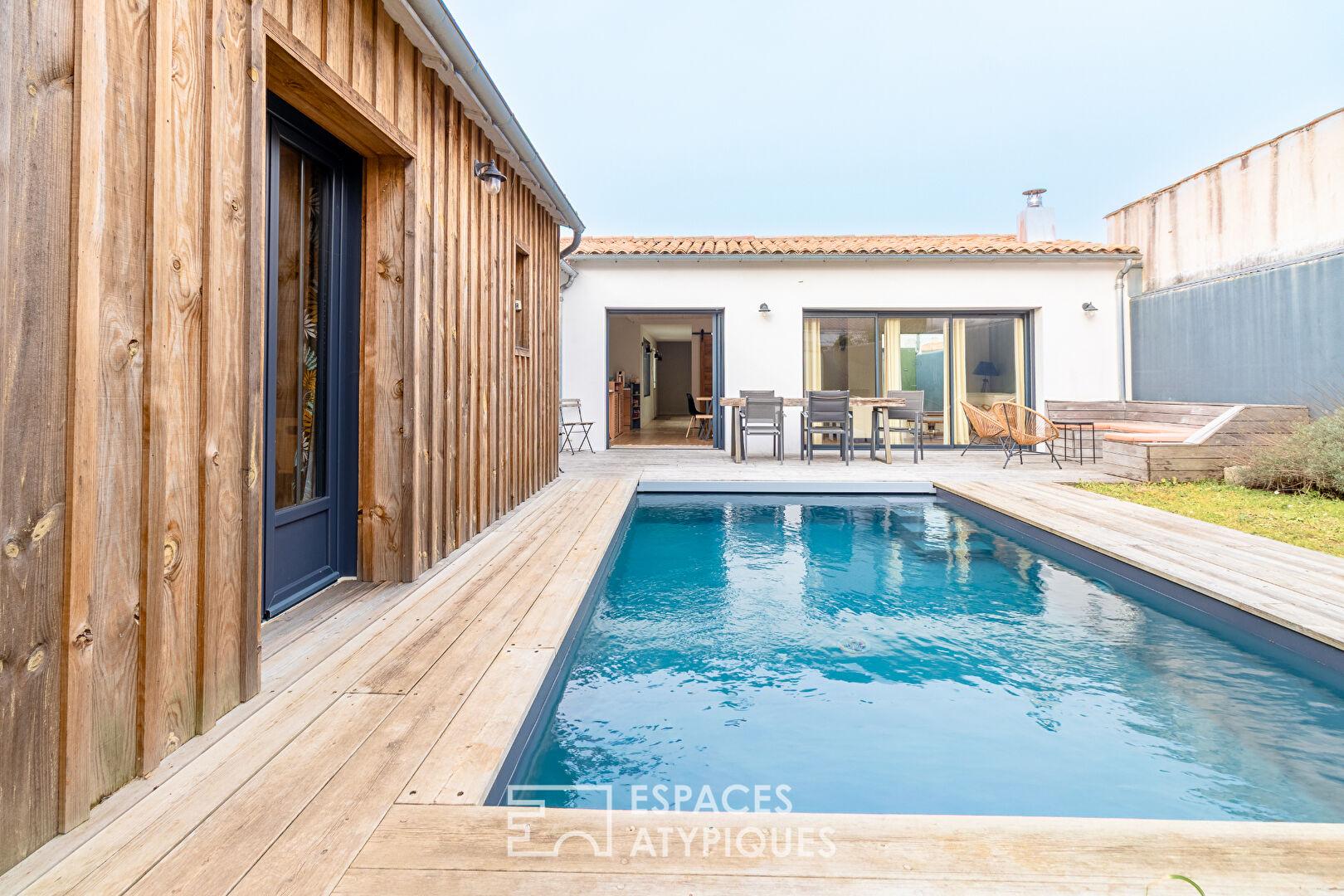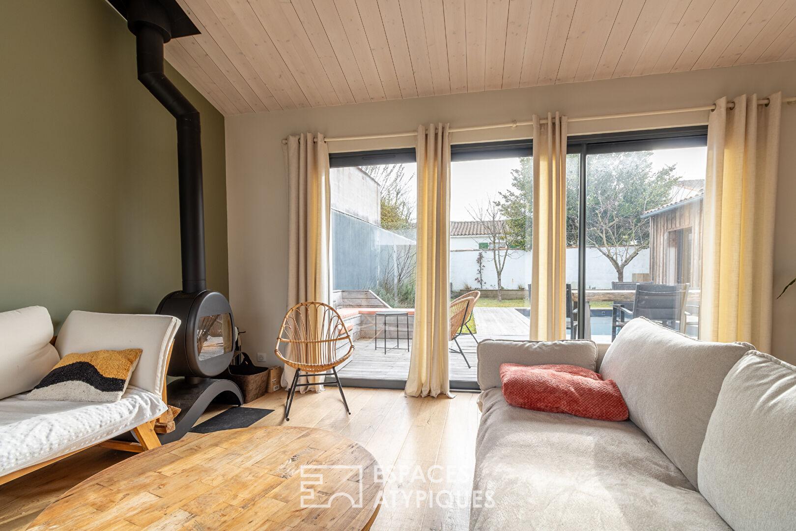 Les extérieurs ont été aménagés comme de véritables salons à ciel ouvert, où la vie s’articule autour de plusieurs espaces dédiés. Le jardin principal, orienté plein Sud, accueille une agréable piscine, véritable oasis de détente baignée de soleil.