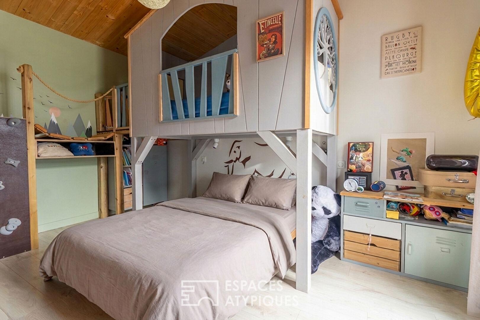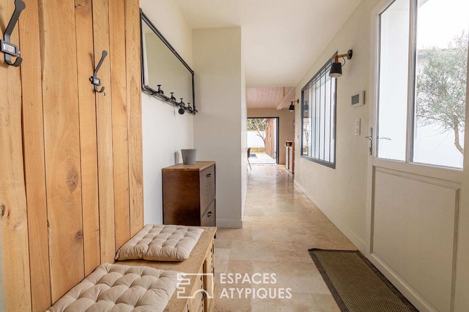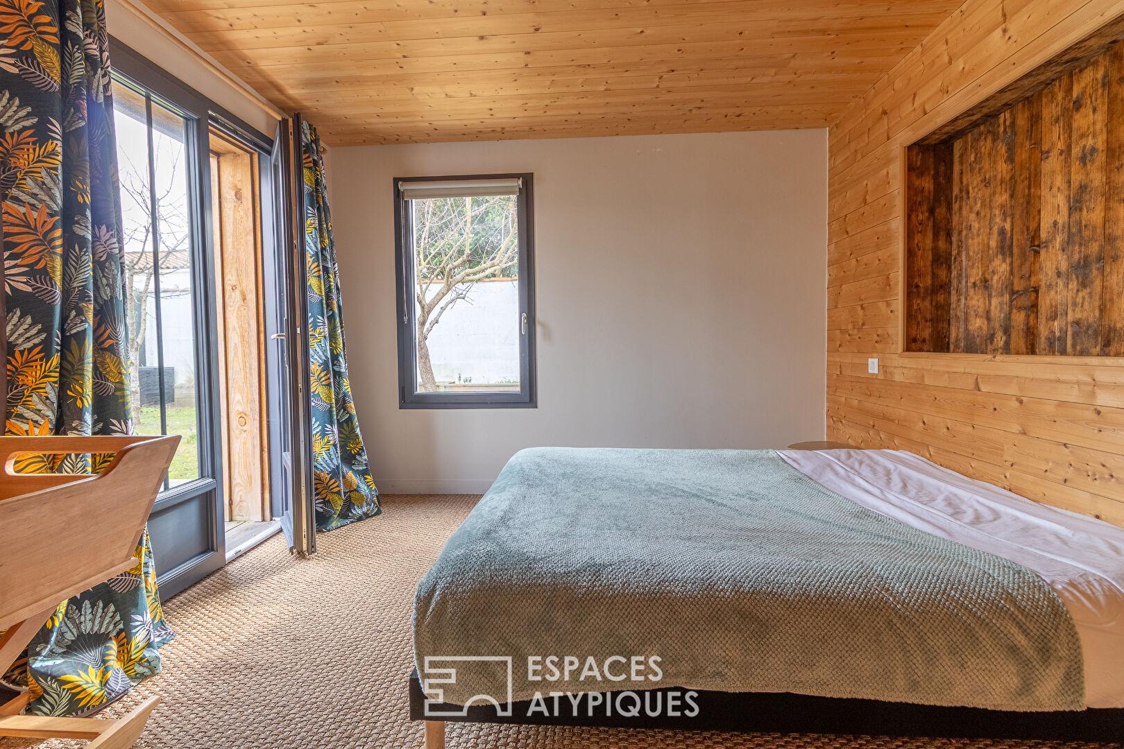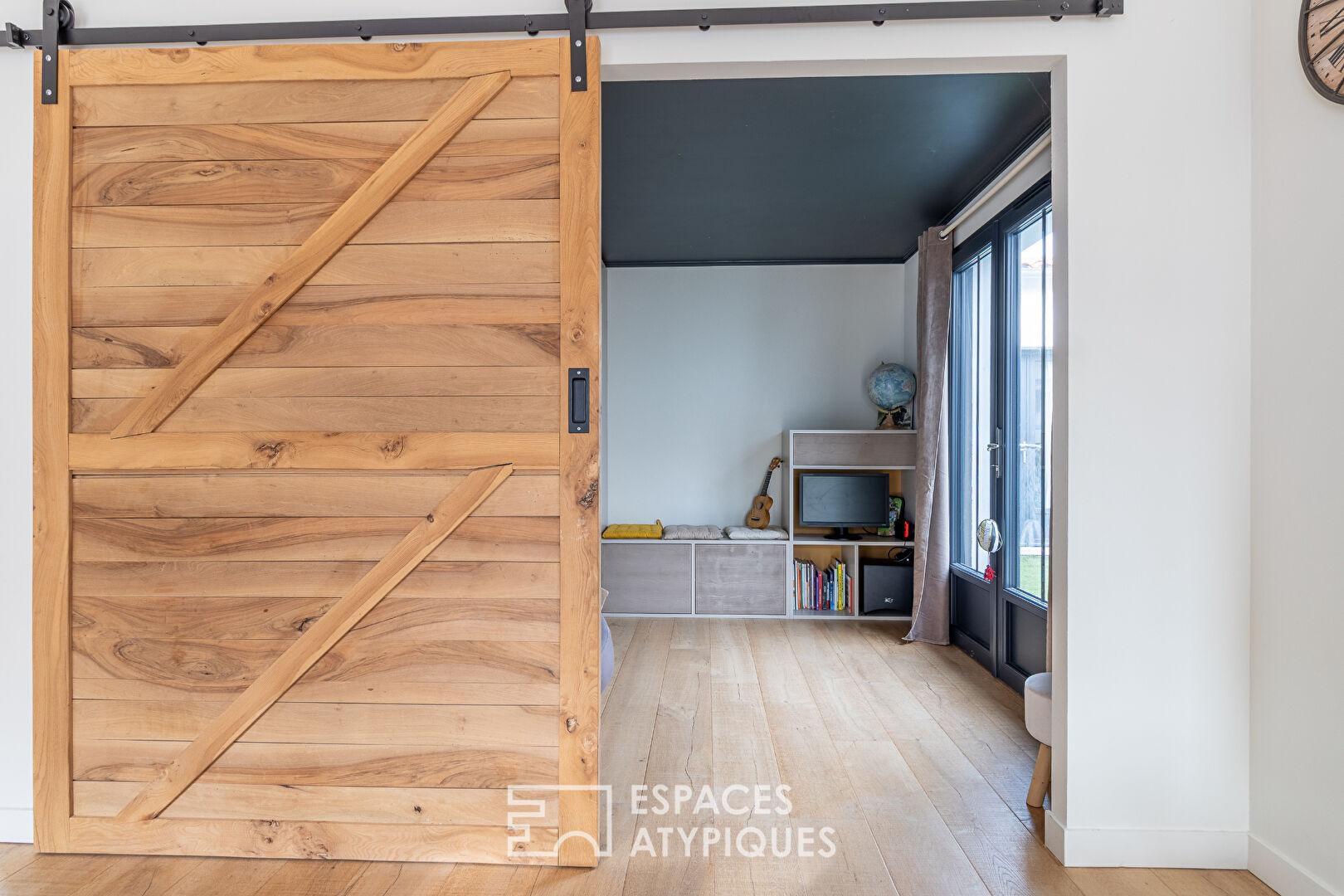 Dès l’entrée, l’atmosphère se révèle chaleureuse et raffinée, sublimée par la présence du bois et des finitions soignées aux accents haute couture. Des matériaux nobles, à l’image du parquet en chêne, viennent sublimer chaque pièce d’une élégance naturelle. La maison se distingue par ses prestations sur mesure : dressings intégrés et mobilier d’ébénisterie créés spécifiquement pour le lieu, optimisant chaque volume avec style.