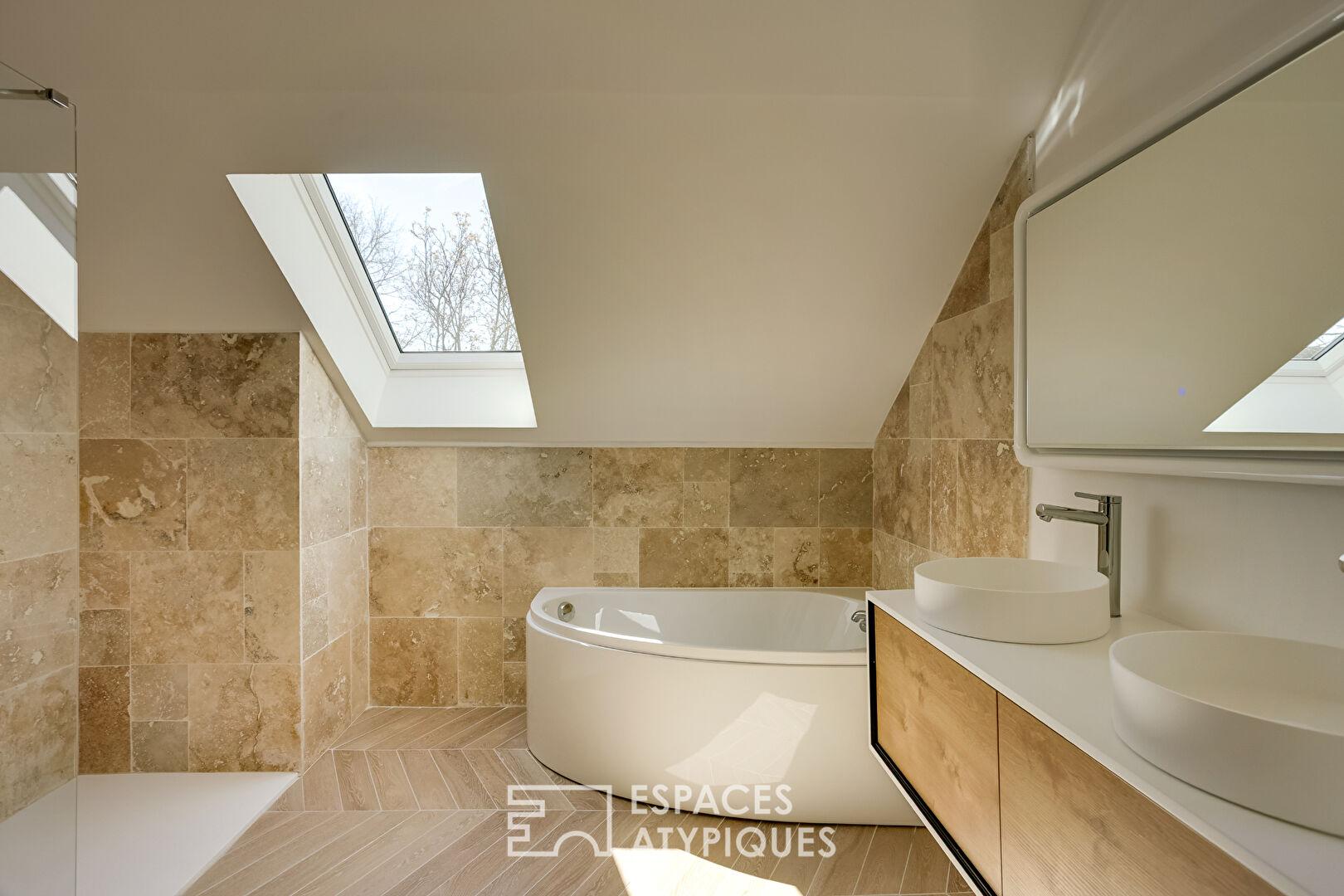 À l’étage, le palier distribue trois chambres, un espace bureau et une salle de bain complète. Pour un confort optimal en toute saison, l’ensemble de l’habitation est équipé d’un système de chauffage et de climatisation par le plafond, offrant une diffusion homogène et discrète.