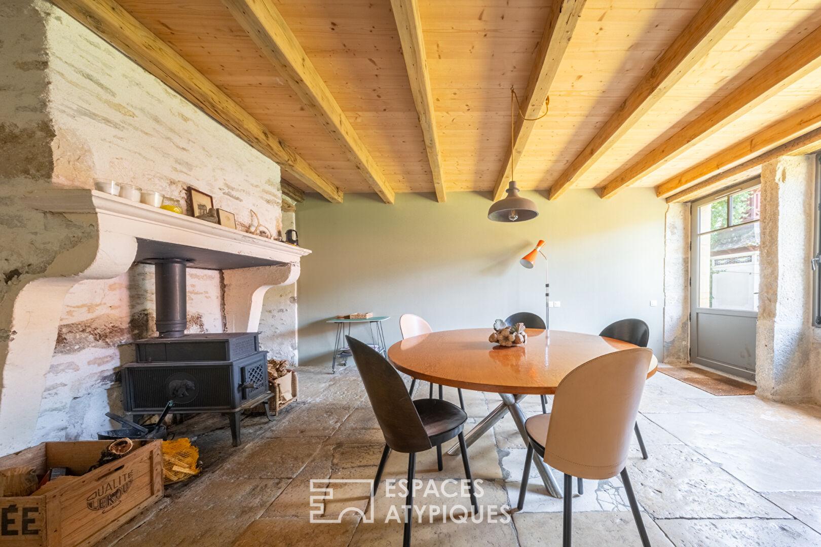 Nichée au cœur d’un parc et de prairies d’un hectare bordés par une rivière aux eaux claires où il fait bon se baigner aux beaux jours, cette ancienne ferme a été rénovée avec âme et caractère par un couple atypique, architecte et décoratrice, qui y ont marié avec audace et justesse la pierre ancienne, le béton brut et le bois chaleureux.