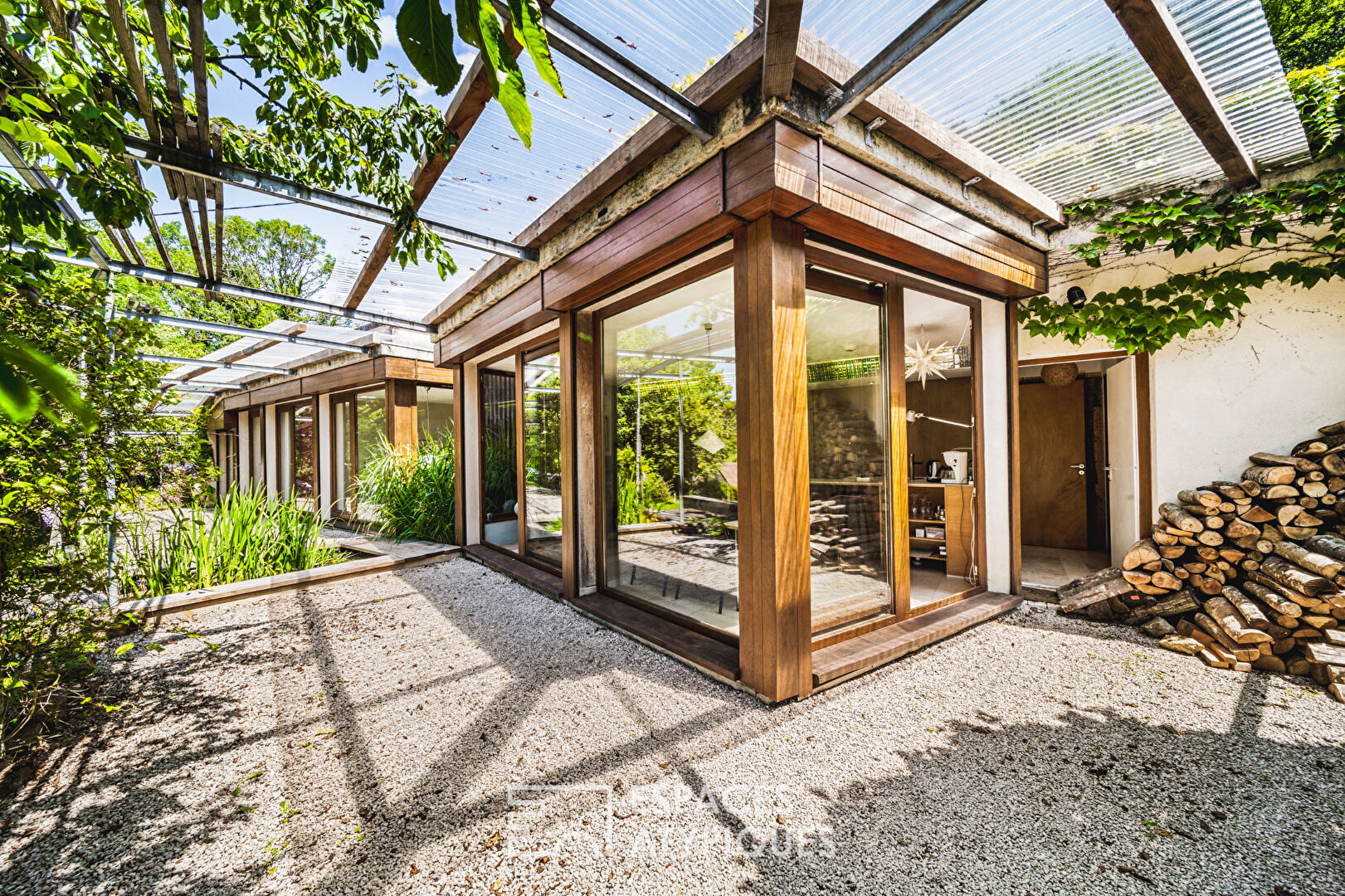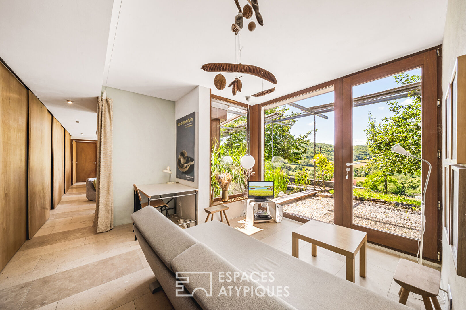 Perchée sur une colline faisant face à Frôlois, cette demeure offre une vue imprenable sur le château et la vallée environnante. Nichée dans un cadre de tranquillité absolue et à quelques encablures des sites emblématiques de la Bourgogne, cette maison d’architecte de plain-pied se distingue par son usage de matériaux naturels et sa conception originale. La façade vitrée sur toute la longueur crée une harmonie unique entre l’intérieur et l’extérieur, accentuée par une terrasse et un bassin, le tout s’étendant sur un terrain de 4040 m².