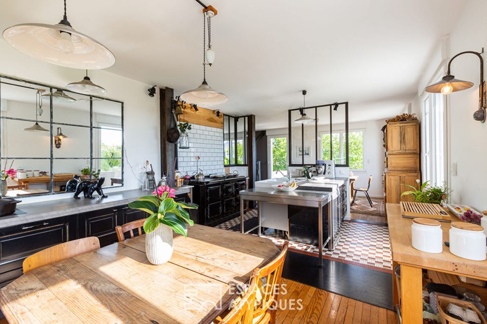 Une allée mène à l’entrée qui s’ouvre sur une pièce de vie lumineuse et chaleureuse. Le salon-séjour compose cet espace convivial accentué par un poêle à granulés et des murs lambrissés. En enfilade, la cuisine aménagée et équipée de façades blanches et de plans de travail en granit noir apporte une tonalité contrastée. Les grandes ouvertures vitrées qui donnent sur le jardin et ses terrasses en bois complètent cette harmonie architecturale.