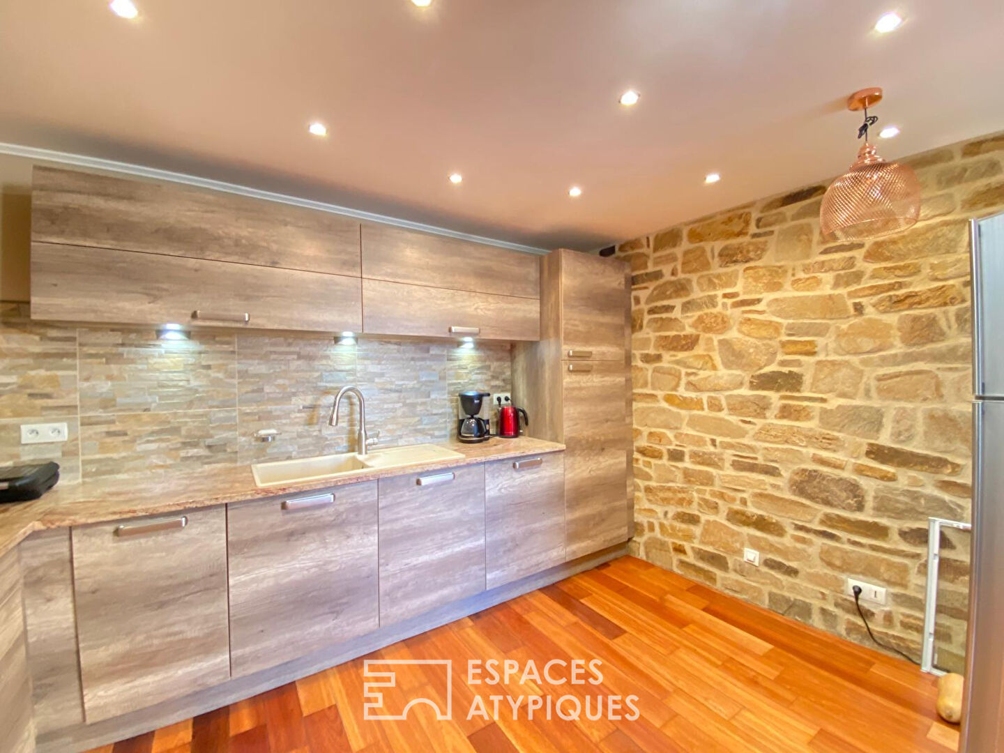 Cette demeure atypique située au fond d’une impasse, sur une parcelle de plus de 12600m2 propose en entrée une zone de dégagement distribuant d’une part un salon aux murs en pierres apparentes et sol en bois exotique avec cheminée insert, d’autre part une cuisine aménagée équipée d’un plan de travail en granit, et en enfilade, une suite parentale de belle dimension avec terrasse en bois orientée Sud et salle d’eau attenante (douche à jets). Dans la continuité du salon, une buanderie, puis une salle de bain double vasque et un wc indépendant. Un escalier tout de bois vêtu permet de regagner à l’étage, deux chambres sous mansardes spacieuses. Huisseries bois double vitrage.