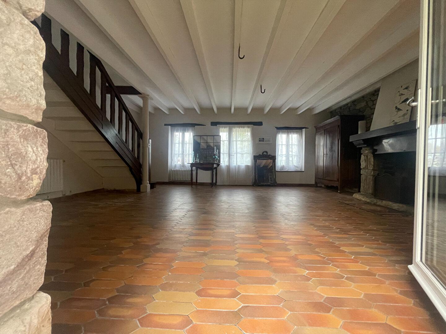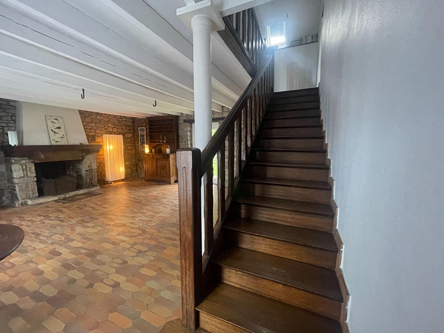 Dès l’entrée, la grande pièce de vie dont le sol est recouvert de tomettes, ses murs en pierre apparentes, sa cheminée foyer ouvert et le bel escalier en bois révèlent toute son authenticité.